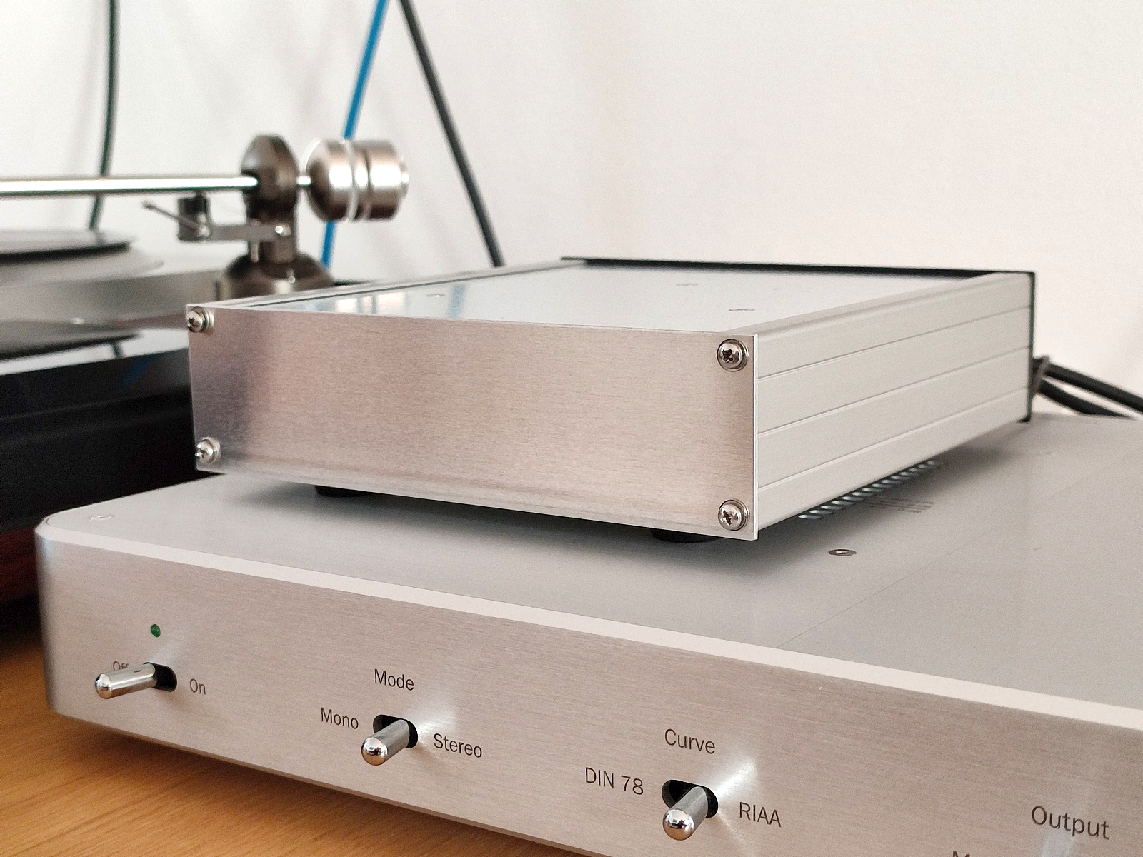 This litte box contains treasure transformers, the pure silver wound transformers LL1931Ag, with amorphous cobalt core. The large box is the EMT128 pre amplifier (Pictured from the inside), using also Lundahl transformers.