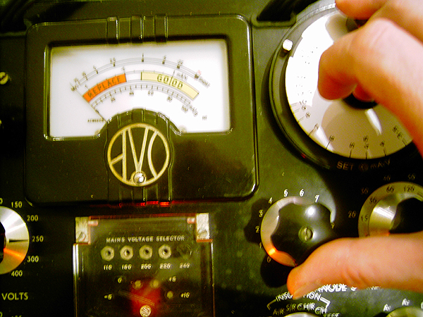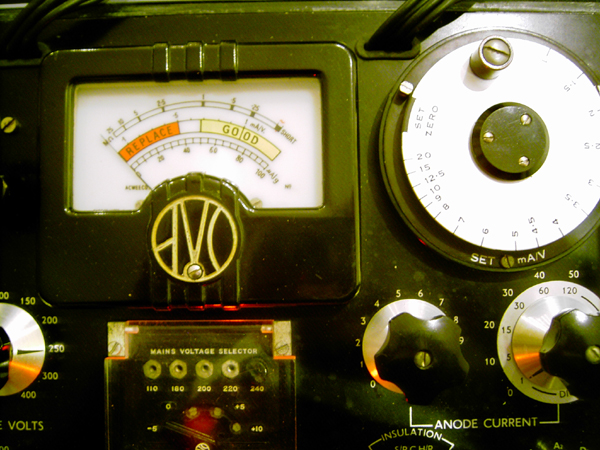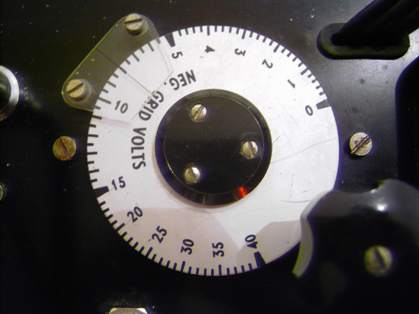 You do not see this here, but you need the rotate the circuit selector switch from the left to the right, trough all positions. ~Set is already done H/ Cont gives full scale when the heater is OK C/H is cathode-heater leakage. Must give very low reading. For calibration tubes I use some that I select for some (very) small reading. So you see this test is working. NOW COMES THE TEST. Put it on TEST! If the meter starts to BUZZ wildly the anode current setting is much different from what the tube is actually doing. You need to work on the outside scale for amplifier tubes, the inside scale is for rectifiers. Keep those scales apartl! Balance the left Anode Current knob for ZERO reading. Your Anode current scale is 0 .... 9,9mA on the left knob. If you can't do that you need to set the right button on 10, and repeat. Your scale is now 10.....19,9 on the left knob. This needs some practice, but you will find it very logical once you know how its done. SO NOW YOU HAVE MEASURED THE ANODE CURRENT FROM ONE HALF OF THE TUBE. (The part called A1, A stands for Anode) DON'T CHANGE ANY SETTING NOW. Now comes The nice part of this tester. Set The big wheel in The middle part of The black marking. This is a switch only, so in The middle is OK Now.... this will cause a small offset if The needle. Now balance The meter again with The left Anode current knob. Do this precisely, and when you see The needle is stabile, quickly do The next measurement. One balanced you turn The wheel as in The next picture until The meter is in The middle of "good". There is a marking stripe there. Adjust The needle on this stripe. Now read The Gm value from The wheel, and you're done. So now you have Ia and Gm at at Ua = 250V and Ug=-8V. Of course you repeat that at any other setting of Ua and Ug. Don't do that now, first go to The next test. Set The wheel on 2.5mA/V which is The "good" value for a new tube. Now you can read on The "REPLACE...GOOD" scale how good The tube is. Any value in The "good" means it is good. In The red means "BAD". Is is in between, it means The tube will probably work, but not very long any more. So no need to be in The middle of The "good" scale. The length of The scale is correct for any good tube. NOW REPEAT FOR THE SECOND HALF OF THE TUBE IF THE METER SCALE LIGHTS UP RED, THE SAFETY RELAY IS ACTIVATED. SWITCH OFF AND ON AGAIN. AFTER VERY HEAVY SHORT CIRCUITS, OR AFTER POST SHIPMENT YOU MAY NEED TO RESET THE RELAY BY HAND. JUST OPEN THE CONTACT VERY GENTLY WITH THE POWER OFF. YOU DO NEED TO OPEN THE TESTER FOR THIS. WHY IS THE WHEEL GOING BACK TO ZERO, AUTOMATICALLY? When you turn The wheel, you boost a lot if current through The tube, it is tested at REAL conditions, so it can get really hot from it. So when you're done, you let go The wheel an this greatly reduces The current through The tube. This saves tubes and equipment. |