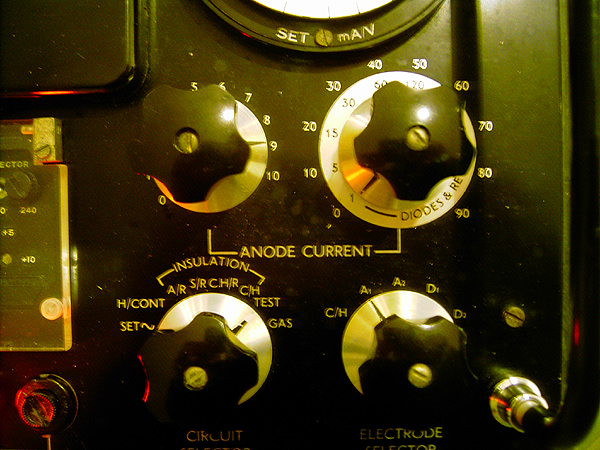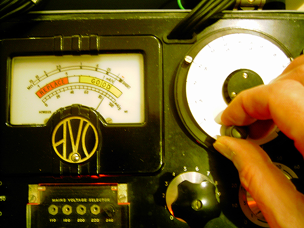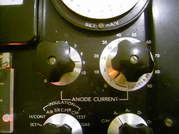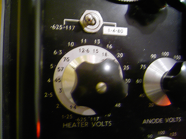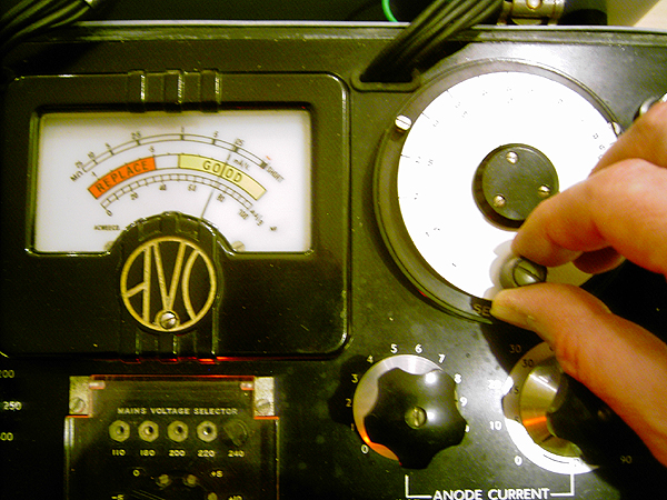 Set heater selector to 6.3V and the top switch to the left to get the outside scale Set expected Anode current to 9mA. That is left switch at 9, and right switch at 0 Set the Electrode selector to A1 Put in the tube. Important: THIS is the octal socket. On the right side is another similar, but this is no octal.