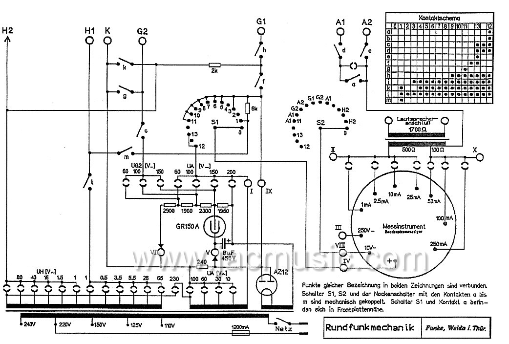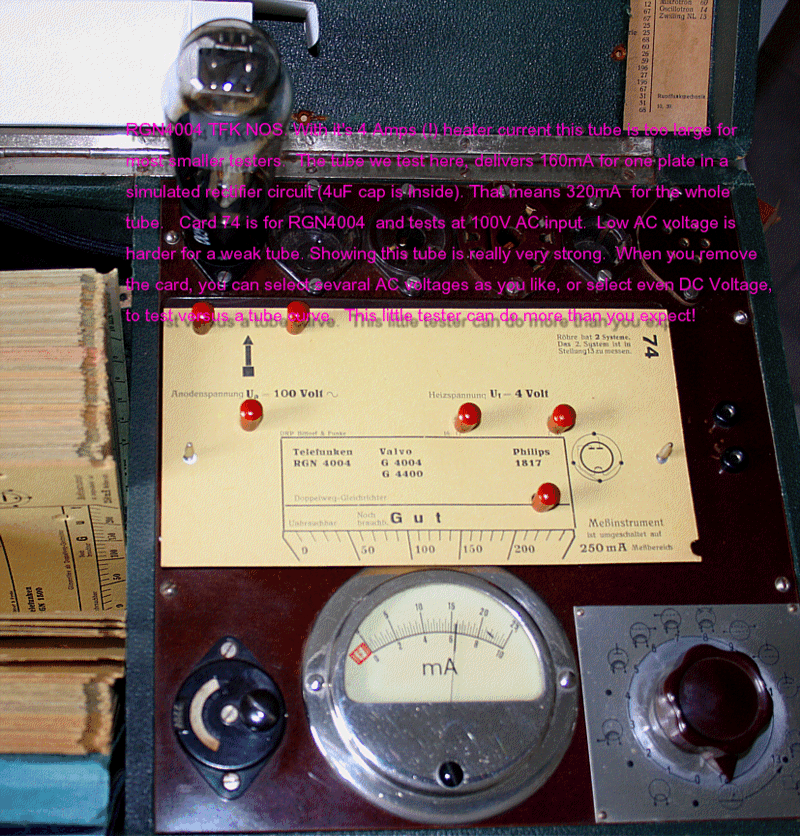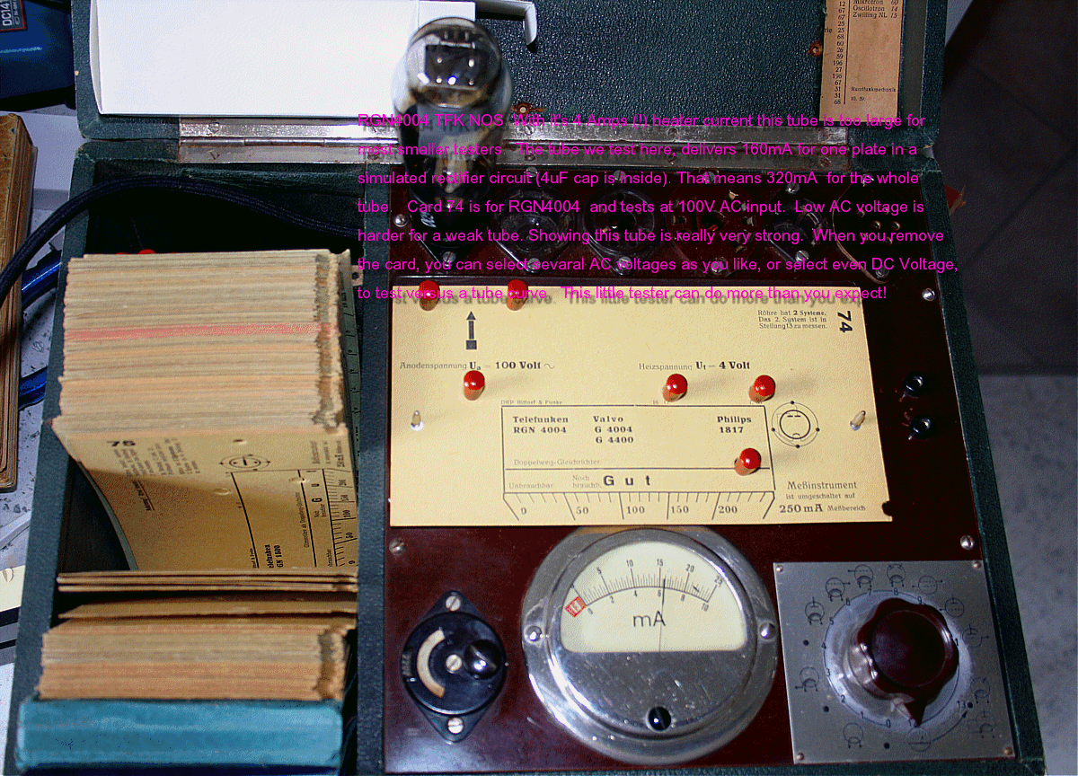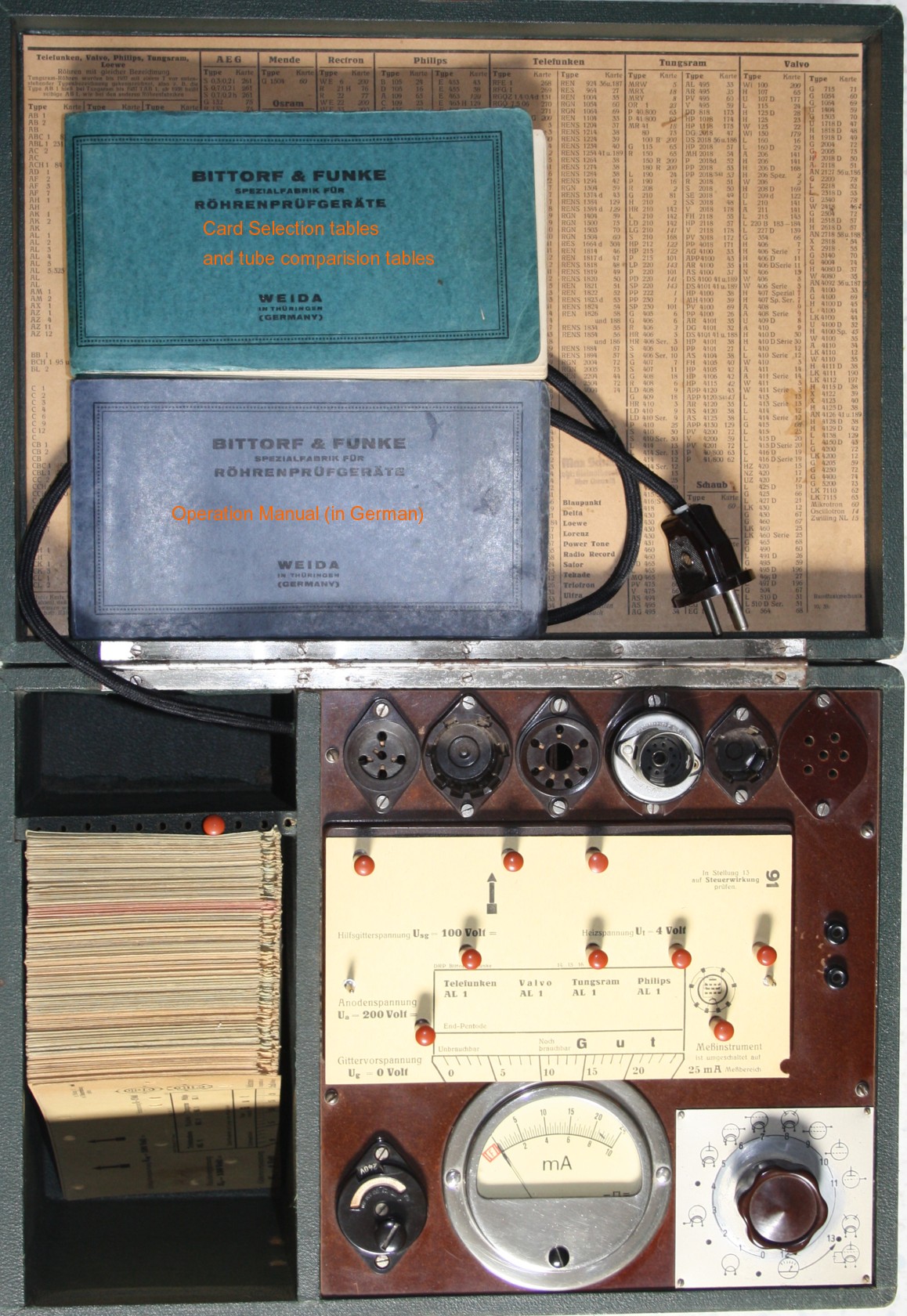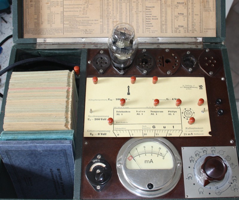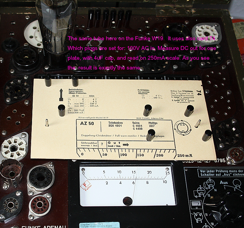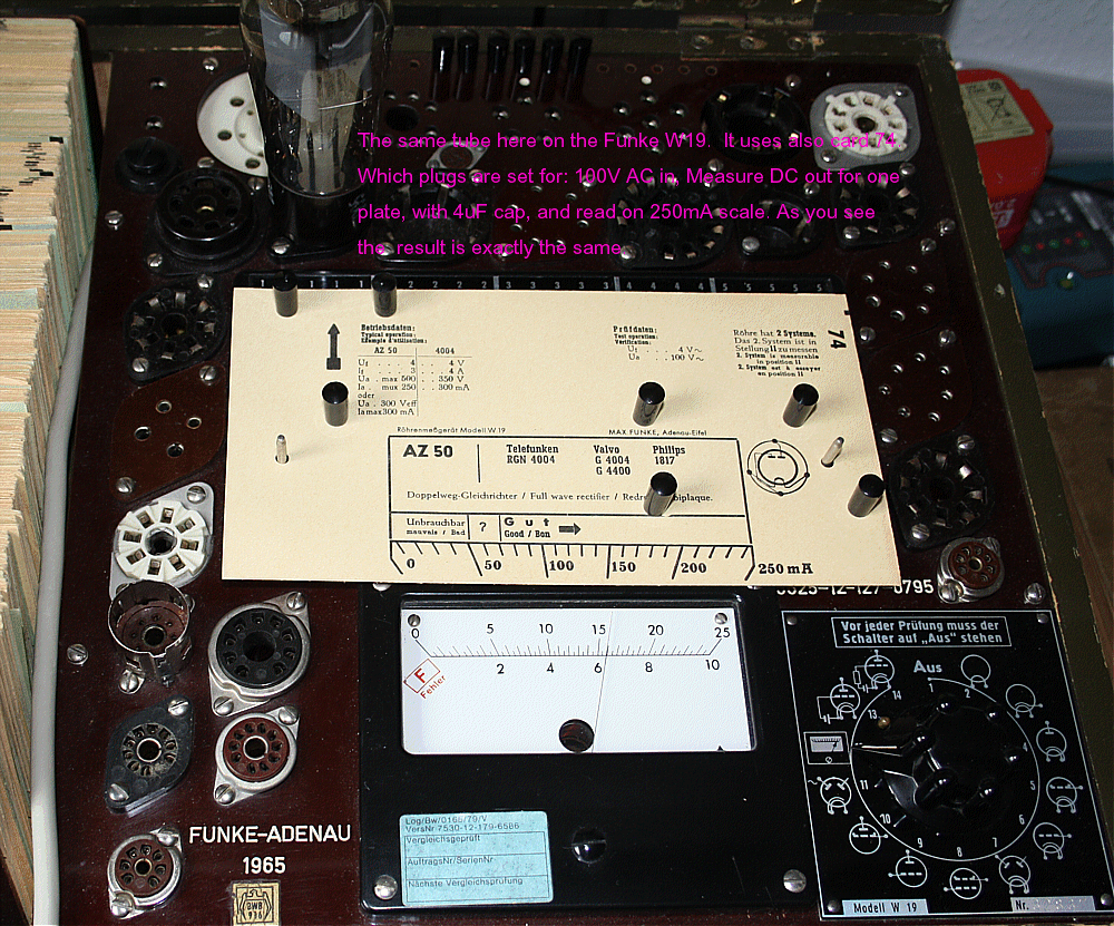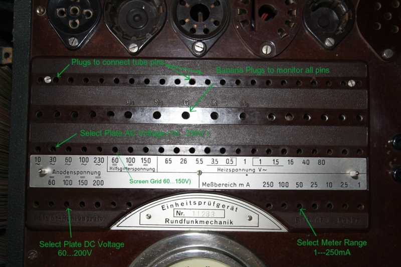 The simple looks, may not make you realize, this is a truly magnificent tester. Test voltage and current is card l programmable, and maximum values are exceptional high. The is the first model of the one-knob testers which works without internal battery, and a stabilized negative grid voltage was generated internally. After this tester came the W16, W18 and W19 which basically work the same, only have more sockets. This tester has received the name "Einheitstester" in English "standard tester" because it had only the European Standard sockets. THIS TESTER IS IDEAL to make your own tube tester of it, and you can test and tube you like, and easily measure plate current digitally. Check for the drawing at the end of this article. Well people know this, and they are no give away on Ebay, but prices are still reasonable, and the tester is totally easy to understand or repair. Don't be mislead by the simplistic appearance! The device is extremely powerful and amazingly versatile. It can do up to 250mA, and a range of tube stabilized voltages can be selected. It can even test some very powerful tubes at unstabilized AC plate voltage. It's all a matter of the right programming. In case you want to expand this tester with more sockets, this is very easy. On position #4 is plugged in a noval adapter socket inside the "Steel tube" socket (adapts tubes like AZ12). A much nicer way is, mount an IEC cable connector to the back. That would give room for three more sockets in the cable compartment, AND you can close the lid while the cable is in the mains still. So in there you might add Octal, 9-pin and 7-pin miniature. To gain more room for more sockets, save the tube books not inside the card compartment. So six more sockets can be added easily, which is probably more than you need anyway. Making new cards for those sockets is easy since on the bakelite cover plate (underneath the card...) all voltages and settings are written. So without card, you can plug it as you like. Then (quote original Funke instructions) you take the most appropriate voltage (EL34 that is Ua= 200Volt Ug2 =150V, but ECC88 Ua= 100 Volt, etc) and you look in the data sheet curves what is the plate current at ZERO Volt grid. Then you set the meter scale such that it indicates this range. For EL34 that is the 100mA scale, for ECC88 that is the 25mA scale. Now Max Funke writes, according to Telefunken Application note 655 (that I do not have for you), the "good" range begins at 70% of this for European tubes and 60% for USA tubes. For this AL4 tube as pictured above the 100% range is 21mA by the data sheet "0 Volt" curve. So the scale of 25mA can be chosen, and "good" begins at 15mA. It is a easy as that! Then connect the tube to the right socket pins, as by the tube data sheet Well there are a few things more you need to look at, but basically this is it. Also look at a corresponding card, how it is made. So above pictured you see a card for a directly heated pentode. If you want to make a card of the "47" which is a USA directly heated pentode, you can borrow most settings from this card to have a quick beginning. Then refine those settings to correspond to the "47" data sheet instead of AL1 as shown here. Like adapt the filament voltage from 4V to 2.5V. etc. Once you have the settings, save them in an Excel table, or overlay a piece of paper on the tester, and plug through the connectors. I have a system like this for my L3-3 Russian tester with Excel which also does the graphics and prints cards even better than the original. Possibilities for adjustment are shown here This tester can really do very much. As you can see above: Plate Voltage AC: 10 - 30 - 60 -100 -230V. This is not only for diodes, but can also be used to test amplifier tubes, same way as a AVO does this, so the tube works only on the positive half of the mains voltage, and rectifies it's own supply voltage that way. The advantage of this method is, the supply voltage for the tube is directly from the AC transformer, which is very strong, and 250mA is possible. Sp at 230V AC that is 57 Watt plate dissipation. Same as with the AVO, effective plate dissipation is only half of it, as the negative half of the cycle is unused. So protection of the tube is good, as heat dissipation is for 125mA, wheras test results are indeed for an effective 250mA. Plate Voltage DC: 60 - 100 - 150 -200. These voltages are stabilized with the GR150 stabilizer tube, where the 150V is directly from the tube, and a remarkable precise reference voltage. The lower voltages are generated with a resistor divider, so these drop somewhat at higher load. This is no issue, as the cards will anticipate for that, and voltage drop is known, and the same for all testers. So when using the 60V tap, and it would drop to 55V at for instance 75mA, it means only the tube is effectively tested at 55V, and the cards are made for this. Meaning the test result, saying "good begins at" is still fully accurate. Heater voltages: You can find those out yourself. It begins with 1Volt when you put in the plugs left and right from the number "1". Then, by moving the right plug into the right field, you add up those voltages as written there. Same for the left plug. So almost any voltage, also for over- or under heating experiments, is possible. Just do not put two plugs in the right field, or in the left field, as that would give a short. This is also the case for all other voltages. So before making a card, think good about what you are doing. Screen grid: 60 - 100 -150Volt DC Meter full scale: 1 - 2.5 - 10 - 25 -50 -100 - 250. The meter itself is not just a panel meter, it is a calibrated multi meter. So the attenuator network is internally build in the meter, and haven calibrated there by means rubbing off a layer of resistive wires. So you find a collection if wire wound coils in there. For the technician, this makes is totally easy to check the meter, as it has simply connections at the back for: 1mA full sca