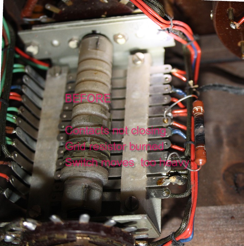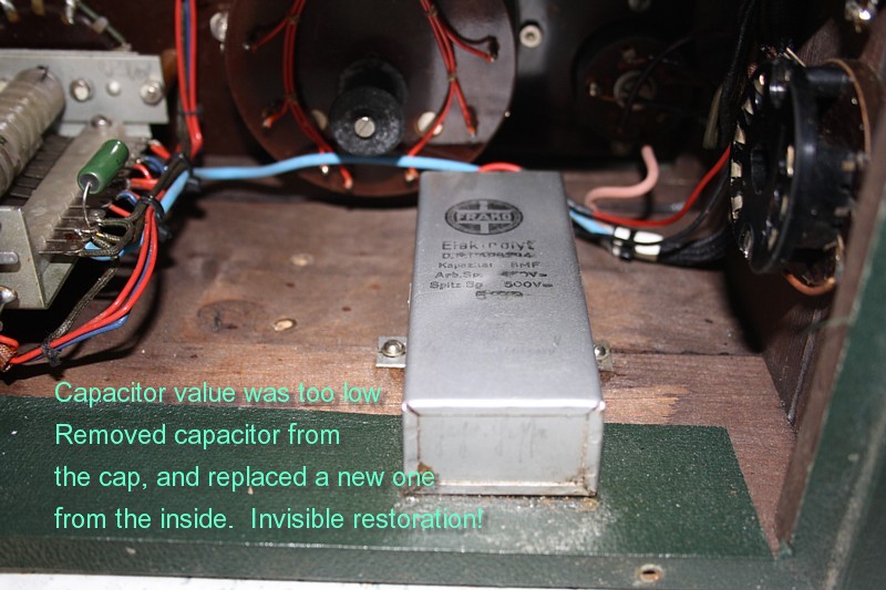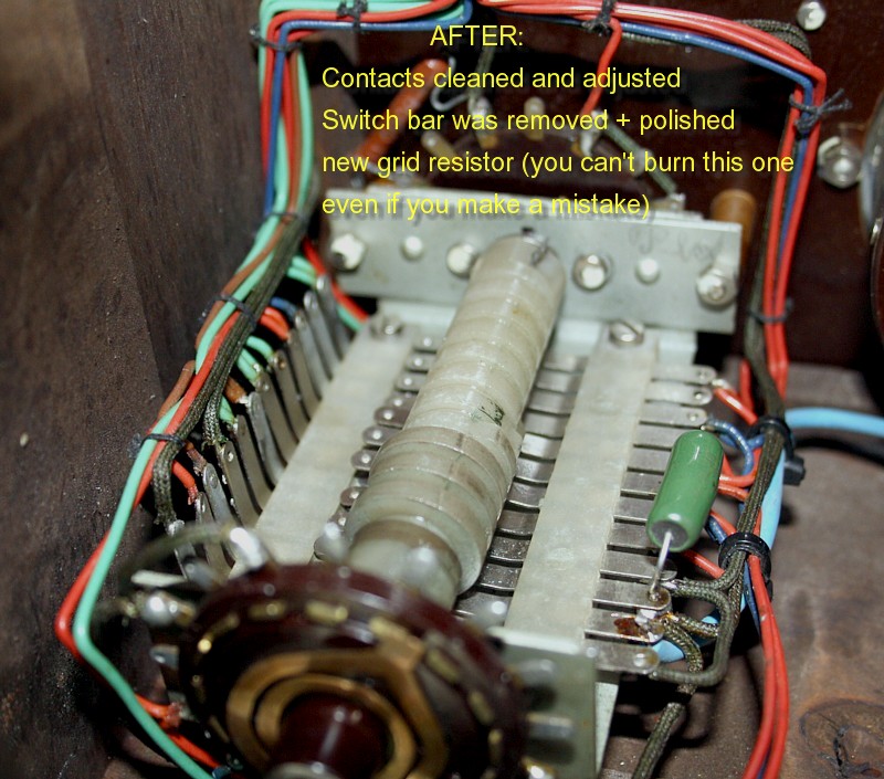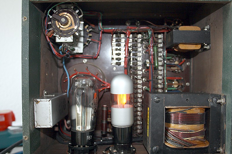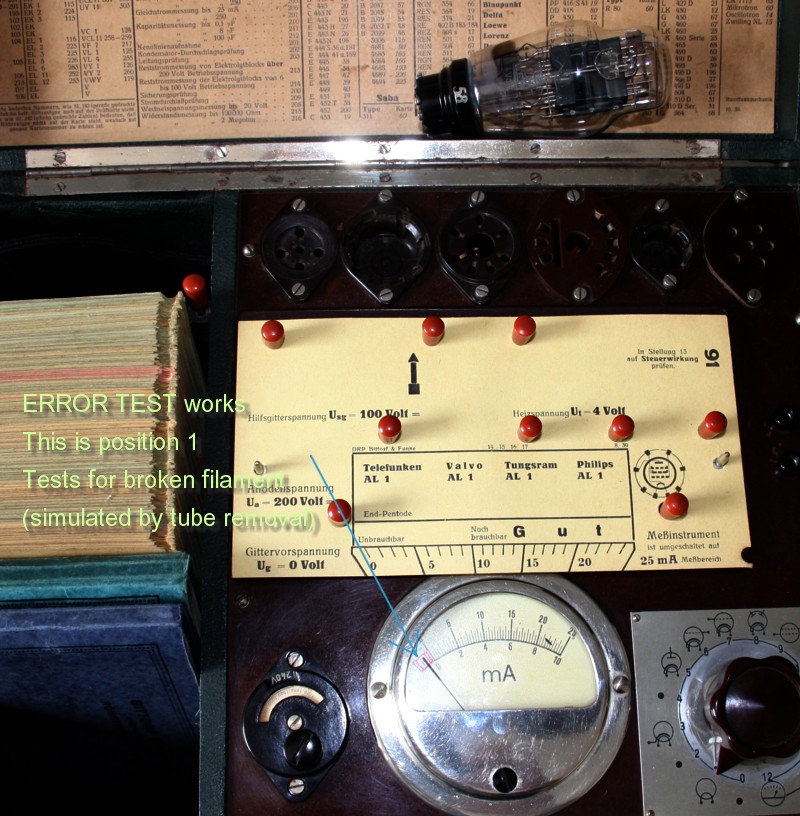 View from the inside. Counterclockwise: Selector switch, multi meter bottom, block capacitor, rectifier tube, one of the two ladder resistors, stabilizer tube, mains transformer, some tube sockets, audio output transformer. Noise check: You can connect a loudspeaker to the banana sockets in the deck, to check for microphonics or scratch noise. This is a normal audio output transformer, the tube under test is now biased in a single ended amplifier at Position 14 at full current, and at position 13 at reduced current. What else do you want :) This is the same test as above, so pos1, now with the tube inserted, so the filament is good. (No error indication)