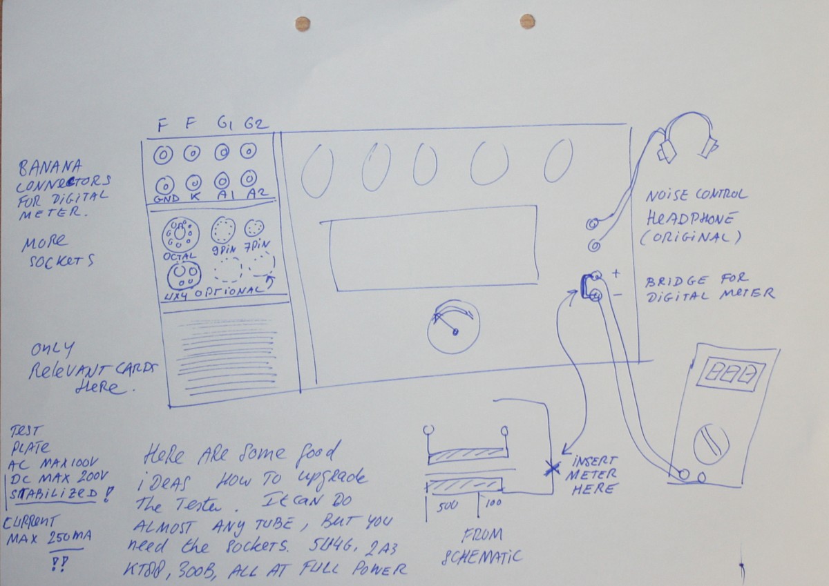 Here are some upgrade ideas for the tester. The headphone is standard, but I would put a an jack plug in it. somewhere else. Then, you can use the original bananas for a digital ampere meter. On the top left is a nice compartment to add banana connectors. Brown for heater. Blue for G1. Green for G2. Red fo A1, Orange for A2 and black for the Cathode. Connect in the schematic above. Add sockets is easy, when you remove the irrelevant cards, and you free some space that way, in the card compartment. The 9pin socket fails the option to select the 9th pin, the card deck has only an 8 pin matrix, but there are many solutions possible for this, too much to explain here, and in the end you can test almost any noval tube still. This tester can test tubes at very high voltage or high current. You test tubes at AC or stabilized DC, as you like. Many settings can be picked from existing tubes, but once you made your first card, you'll find it easier to make your own. For instance 2A3 settings are the same as for AD1, but 2A3 is 2.5V heater. So add a UX4 socket, set the heater to 2.5V and you can test 2A3. KT88 is the same as AL4, but 6.3V. Etc Etc.