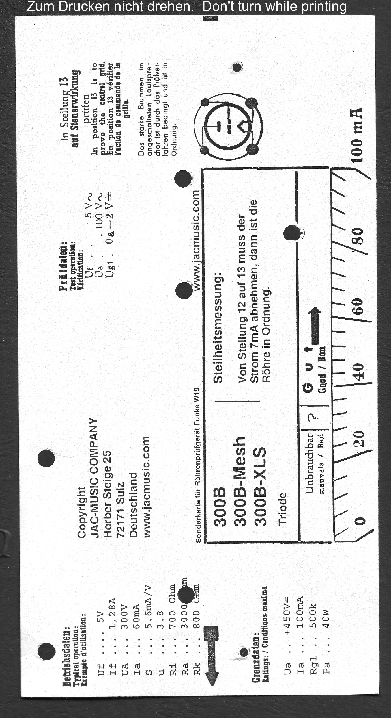 Funke W19 is probably the most popular tester in Germany. It has no card for the 300B, but I found this tester is very capable of testing a 300B. If there is anyone who knows why Funke never published a 300B card, let me know, I'll be glad to place that information here.