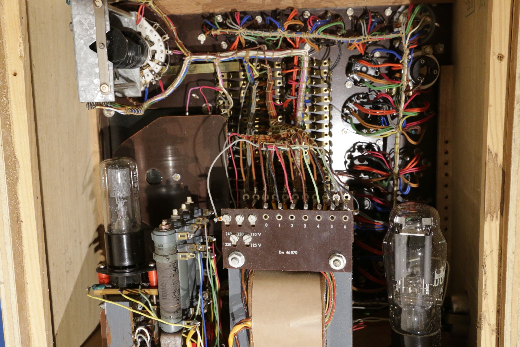 Close up of the stabilizer tube. This tube, when heavily used will become somewhat silvery or grey on the glass inside. Though such a tune will normally deliver it's 150V, it's internal resistance is higher, meaning the load characteristic is not as intended any more. Some tubes react quite strong to that, and that would give a wrong reading. These original (Funke qualified GR150, not just any GR150) have a fully flat load characteristic when new. At end of life, the burning color gets darker, and the internal resistance goes up. Needless to day, this this is new condition.