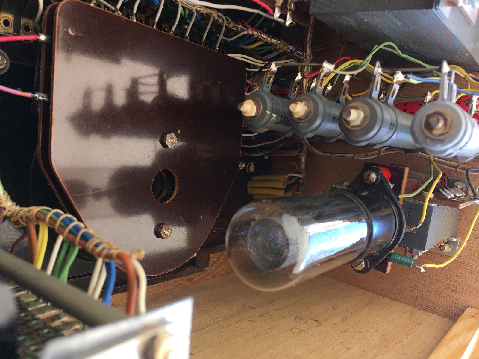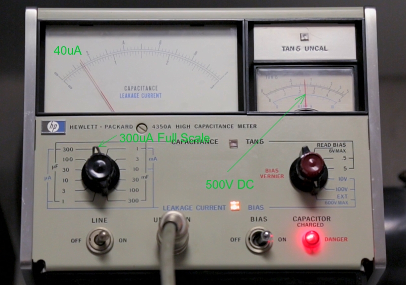 Before switching on, I reformatted the capacitor, because I prefer to let the original parts in, when still good. However simply "switch on" such an old capacitor will damage it. At first it will resist no higher voltage than 50V, and draw several mA if you try. Then it works the same as charging a battery. So voltage goes up very slowly, as long as you give it charge current. Yet with capacitors this should be in the 50uA range. Then at 500V it more or less stopped "charging" and began to need more time. Yet when waiting long enough and at very little current, it would charge up to 550V and I stopped at that point.