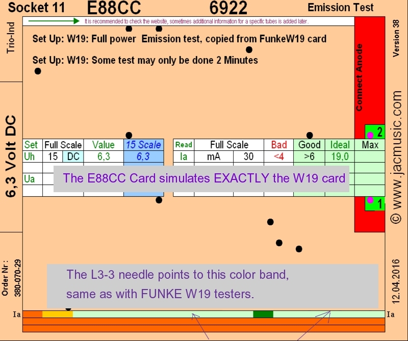 The purpose of the W19 is to tell you if the tube is 'strong' or 'may function' or 'bad'. Specially the 'may function' range is one to consider, because if you find such a tube in a working amplifier, you can as well leave it in. These are the words of Max Funke, in the blue book, belonging to the W19 tester. W19 tells you, if the tube must be replaced or not. This is a real emission test, one of the few ones that are really good. To do it professionally, requires a regulated anode voltage, and both W19 and L3-3 have that of course. L3-3 is so versatile, it can indeed copy the configuration of the W19 tube tester + it's test card set up. So this is what those 'W19 simulation' cards do. Read the long explanation for details.