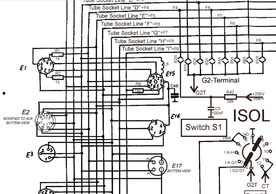 Note: Cross check with the plug desk is just an additional test. You can plug the probe of an Ohms meter in there, and check against Socket #2. As this also connects the cross bars, you can NOT use this to find the lines (F1...F8), because it will give a "connection" with more than one plug holes. Still, when checking, there should be no "open" contact, or you did something wrong. For finding where the "Lines" are, use socket E4, as this socket is wired directly with contact 1 to line F1, contact 2 to line F2, etc. Before doing so, remove all plugs