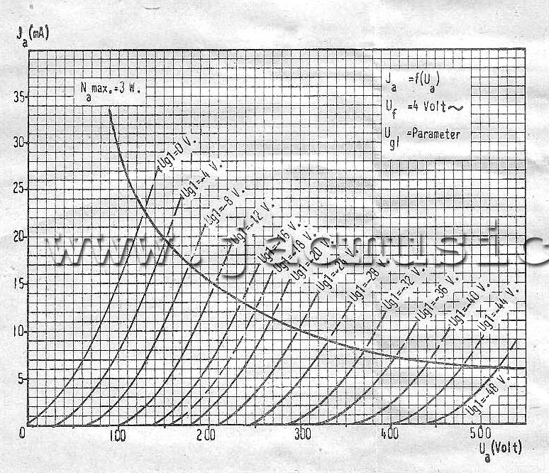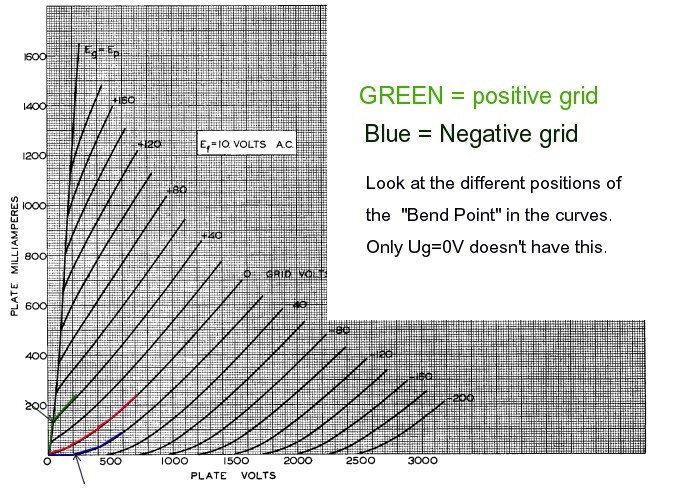 A note from de Department of misstakes Please understand what I write here is my personal opinion only. There is no special intend to write negative about companies products, but we do need to call things by their name. Software Error #1 In both testers, the heater voltage is connected with one end to ground, and the other end is heated with DC. This is for practical reasons, and I would have done so the same way. You will say, ok so what? For indirectly heated tubes that is no problem, but this gives a real issue when testing directly heated tubes (DHT). The reason for this is, with DHT, the cathode's electrical reference is by definition the center of the filament, and really not one of the two ends, to your own free choice. There is little understanding about this, and it is amazing how even professionals are totally surprised when you bring up the subject, and even start to argue about it. Now you can connect a tube like 300B with one end of the heater to ground, and the other to +5V. Sure that works, but you might just as well connect that other end to -5V. Still as you can understand +5V or -5V will result in another grid voltage needed for the same plate current. So perhaps if you thought this makes "no difference", well here you have already a difference since that needs another grid voltage. There is this rule saying the cathode of a DHT is the center of the heater, and there is no rule you can take either end to you free choice. There is no outside world connection to the center of the heater, but inside the glass bulb it is physically present indeed. Just not connected. So if you connect the heater with one end to +5V, the physical center of the heater is at +2.5V now. You have lifted up the cathode reference point by by half of the heater voltage. Not much of an issue when the heater center is at +2.5V and the grid at -60V, and you have a low gain tube such as a 300B. The error is 2.5 Volt only and you would not even notice at this low gain. However it is a major issue with a tubes like RE134 or the Emission Labs 30A, that work at low grid voltage and have high gain. The 30A has -3 Volt grid voltage, a 5Volt heater and a gain of 30x. You can not just allow an error of 2.5Volts on a grid of -3Volts. To put this in a numeric example: Suppose you tell the tester to apply -3V to the grid, that's what it does. Then to the heater is applies +5 Volts. So the center of the heater is now at +2.5 Volts and the Grid at -3Volts. The effective heater voltage is in reality -5.5 Volts and not -3Volts. All of this would be no problem, BUT..... the software still thinks it's -3Volts Grid voltage. (This is the ERROR we talk about) So when the test results are printed, the tube had EFFECTIVELY -5.5 Volts applied to it but it says -3Volts everywhere. The Amplitrex AT1000 (and the Sofia) make the same mistake. The fact that doesn't have to be that way, is proven by the Russian L3-3 (analog) tester which lets you even choose between AC and DC heating, and does NOT make this mistake. Test results are identical. Now I heard someone call the "one end grounded grid" another method, that Jac doesn't agree with. This is an excuse. I see no problem with the one end grounded grid at all, but I see a problem with SOFTWARE ignoring the effects of this. Let me explain the error here, by using the 211 tube curves. The 211 can have some limited positive grid voltage, but let's look at the 0 Volts line first. You see it starts exactly where the two axis cross. This is important to notice. This how you recognize this (only) tube curve without grid influence, or in other words with 0 Volts grid. Here, for the 211 tube, you see the -20Volt line starts NOT at the graph corner. There is no Plate Current below +200 Volt. So if you need a certain plate voltage before something happens at all, this means a negative grid voltage was applied. Even so at positive grid voltage (which the AT1000 and Sofia can not do) the effect reverses. The curves of +40V and -40V grid look like mirrored. Only at 0Volts these "dead" zones fail. Here comes the issue with the AT1000 and the Sofia, because with a 211 the cathode center t would be at +5V, the way this tester is constructed. Now, with a 211 the effect in reality will be small since +5V is not a big error on a swing of -200V as you can see in the curves. I just picked this tube to explain the curves and have a look at what positive grid voltage and negative grid voltage do. Also to show the 0Volt line is unique in character, and it can be recognized clearly.