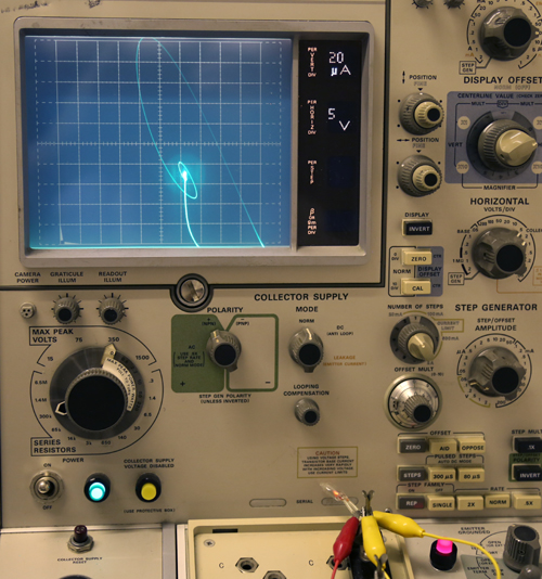 This basic, very simply curve tracer of the HAMEG 203-4 oscilloscope is actually a wonderful feature on the bench. Junction transistors, so the normal PNP and NPS, if defective, do not show correct forward and break down voltage any more of the base-emitter diode. (Break down voltage is appr 7V). So a quick look on the curve trace will show if the base-emitter diode is good. If good, the transistor has at least basic functioning.