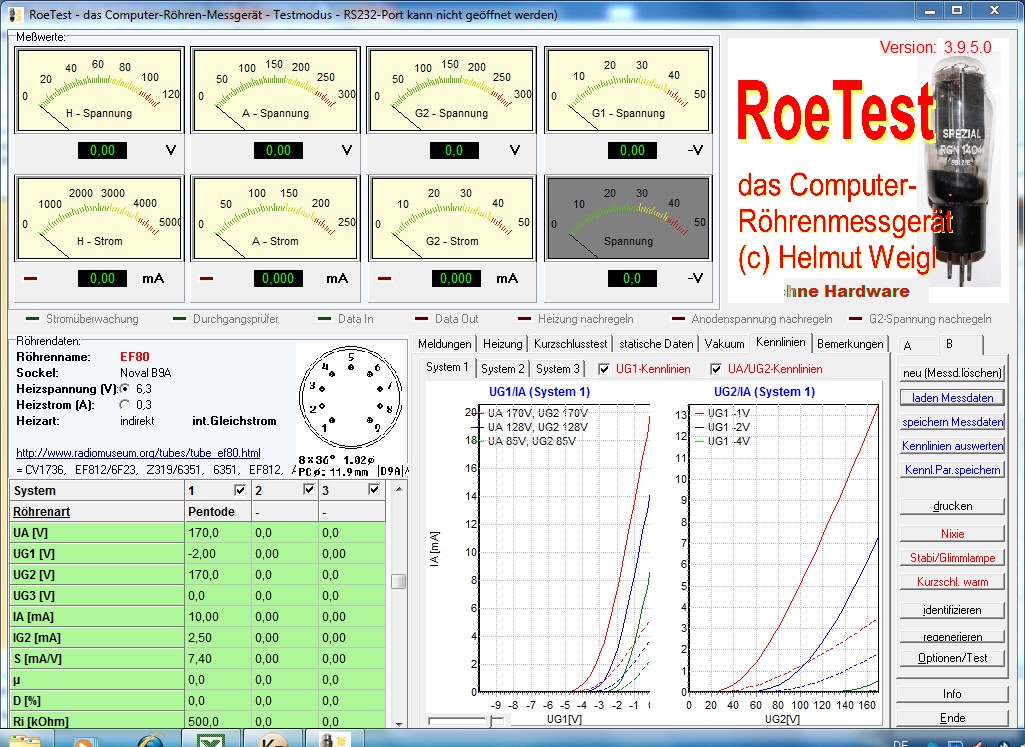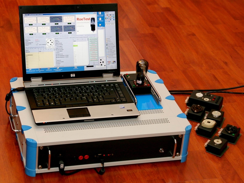 'ROETEST' KIT BY HELMUT WAIGEL, GERMANY. Originally listed as a DIY Product, I have removed it from this category, and put in under professional products, right here. This a KIT version. What is provided by the maker, is all hard to get hardware, such as the mains transformer, pre-programmed microchip, the front plate, empty printed circuit boards, etc. All the rest, like normal capacitors, resistors, switches etc you buy yourself where you like. 'RoeTest' is German for 'tube-test'. This very nice product, is privately made by Helmut Weigl in Germany. This is digital tube tester, the most interesting one I know. This is a kit, so you have to build it all by yourself. What you see here, is a possible way it can look, as made by the DIY builders. So the housing is your own project. What you can buy is a CD with the circuits, the description, the software, plots of the printed circuit boards, a drawing of the front plate + company address who makes the front plate for you (or design your own). Printed circuit boards can also be provided to you, as well as some of the hard-to-get hardware parts such as the transformer. This list ends with the on-board software that you get burned into a micro processor which is part of the ROETEST DIY project. All of that for a price that I think is extremely reasonable. The pleasant thing is, this tester is kind of non-compromise. It is based on a motherboard, and then simply one board for each function. So you have a grid voltage board, a plate voltage board. etc. Any problem with a board is automatically reduced to that one board only. Kind of easy to repair and easy to service. Not fo forget a FULL switchable relay matrix board. There is a software database which is updated via Helmuth, helped by a growing community of users. That database alone is fabulous. This product is really 'it' when you are a DIY. Brief specifications: Anode max, 606V 250mA. Heater 0...127V. Until 12,75V 5A. Until 127V 500mA