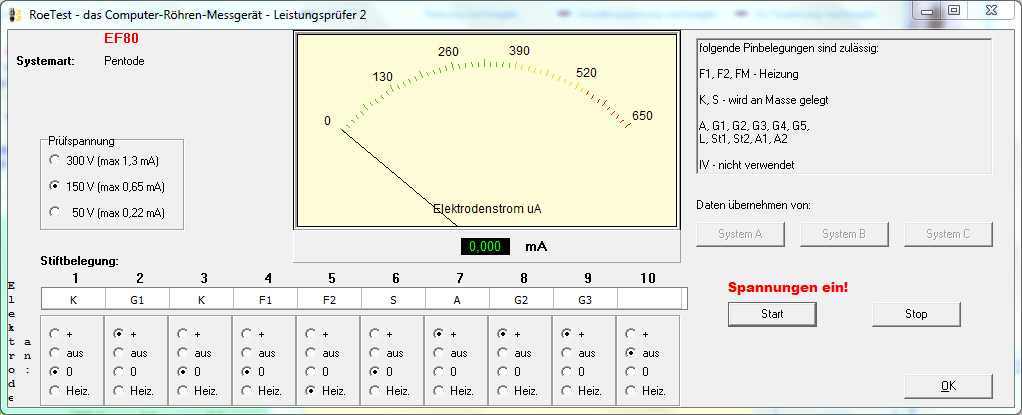 1) Parametric Testers. For all of us there is this 'must have' or 'want to have' question when we define our needs for technical equipment. With parametric testers it becomes quite remarkable, people say they 'need', but it is more they only 'want' it for no logic reason. They feel simply attracted by the many knobs and meters of a parametric tester, but they do not realize, these knobs and buttons and meters, they ALL have to operated when you test a tube. Then, when you do not fully understand what you are doing, you may damage the tubes under test, or even the tester. This is really difficult to hammer into peoples mind, but it is just for this reason, Emission testers were made. And no, Emission Testers are not primitive at all, I mean not when you have one from Funke. (more about this later...) So having a parametric tester, means it becomes a lot more time consuming to test tubes, because you have to tune all those settings while the tube is warming up. So when you change the plate current (by yourself, or just because the tube is warming up) you need to re-adjust the plate voltage, as it tends to drop. Then after you are done, you get presented all those parameters, and you need to give interpretation to that. Hopefully you know how this is done. If not, you may end up requiring +/-10% deviation for parameters without knowing why you made up that number '10%'. And no, datasheets don't help out with that. Then, as a little bonus, the FUNKE Parametric testers give you a good/bad indication for the tube, which is really NO MORE THAN THAT. This is very important to understand. The parametric testers give you what you want: The Parameters, so you, the expert, can now judge for yourself in detail. To put it in simple words: A parametric tester will give you the tube PARAMETERS, and not the TUBE CONDITION. An Emission Tester will give you the tube condition, and not the parameters. Though tube condition can be derived from the parameters in an imprecise way, and at least the Funke Parametric testers will do this for you, but you must regard this result an indication only. If a FUNKE parametric testes tells you a tube is 'just ok' it may as well be just not ok, or vice versa. So, if the holy grail question is how much lifetime is left inside, then you what you need is a Funke Emission Tester, which is specially made for this purpose only. 2) Funke Emission testers. Make good note, the Funke Emission testers have nothing, really nothing to do with all those cheap, crappy little testers that you can buy on Ebay for prices from 100..300 Euro. Such are worth almost nothing, and they are only useful for what they were intended for, and that is find the broken tubes in a malfunctioning radio. A really high quality emission tester, is something else. This tests the tube's Emission under hardest possible conditions. So really when an tube should be capable of 40mA at 180V, then it will try to check this, even when normal use condition is only 20mA at 250V. So as you can see from the example, the tube is even thermally overloaded at 40mA /180V, so the handbook for such an Tester will say not to test the tube longer than 30 seconds. This is a real emission tester. Again, not to ne confused with the Junk on Ebay. An Emission tester is testing all amplifier tubes (...hold your breath...) like a diode. I also wondered myself what the idea behind this is. At first I thought that was a cheap way to test tubes. How much I was mistaken by that! Later, I found the answer in the blue book by Max Funke. The idea is indeed having no interest in Grid voltage settings of the tube. The method Max Funke uses, is very wise. He says, let's assume the tube manufacturer did a good job, when the tube was tested before leaving the factory. This means, the transconductance was above minimum and below maximum. Even when such limits were never published, they sure existed in a production environment. Same for the plate impedance, and the tube gain. This was all within their own (un)published limits. Also the plate current at specified conditions was correct. Then the tube was found to be good. It was sold, and used in some equipment. Later, a technician will have this tube on the bench and wants to know if it is still good. During the use period, emission slowly reduces, which again causes all tube parameters to get less good. Now, Max Funke says, all we need, is a fully reliable way to find out if the emission is still good, and if so, all other parameters must be good also. Of course this assumption can only be true, if the tube has no leakage or vacuum loss, and if basic functioning is still given. Here is the proof: If you have some worn out tube, that you intended to throw away, you can re test it at 50% higher heater voltage, which boosts up emission to 'like new' for a short time, and you will see the worn out tube tests like new this way. Or, vice versa take a new tube, and reduce the heater voltage by 50%, and you will see all dynamic parameters, and plate current are the same as with an end-of-life tube. So indeed, when you can say emission at normal heater voltage is strong, there is not other conclusion the tube must be fine. Let me repeat the assumption, the tube was fully tested by the manufacturer, and the tube passes now a leakage and gas test with good result, and basic function is given. So the Funke emission testers works like this: A) Test the heater. B) Test all electrodes for leakage, one by one. C) Test emission. D) Test for Basic function. E) Test for gas.Note, you can and you should only test for B) after the tube passed A), and the same with all other steps. If it fails at one step, you need to stop and reject the tube. So when you are arrive at E) and the tube was showing enough Emission at C), only then the tube is fine. All of this is done with just one knob, and takes less than a minute. Personally, I believe there is no better method. The question is only: How to test emission? For this, the