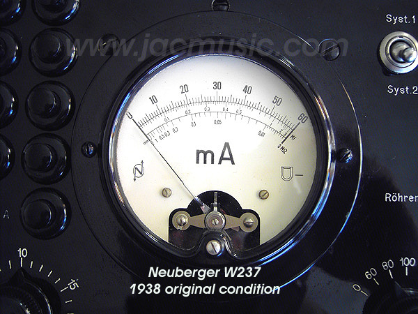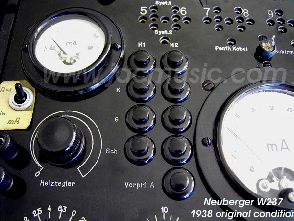 Neuberger RPG237 from 1938 Front plate - Leakage-tests-buttons. Lovely build tester, with high quality switches and precise meters. The Neuberger RPG 237 was a standard for it's time.It is an AC Tester, sweeping a tube through the WHOLE RANGE tube curves while testing it. So getting '20mA' as test result, means it sweeped the tube through the complete set of tube curves, at different plate voltages and different grid voltages, and it produced 20mA as an average value. Suppose you measure a tube that must give 20mA at normal settings. The RPG237 then gives a very good impression of the lifetime left in the tube, because if the tube can do the 20mA, but cannot do the peak current anymore, you will get a lower reading than 20mA, which is right! This instrument is a genius. It's not in the manual, but since it can measure e capacitance, What I do have to say here, this measurement method is generally inaccurate. Even the so called 'top class' AVO's give nothing but a rough estimation. However.... not with this tester! Interesting is that although there is little electronics inside, In a few words: Still perfect fine after 70 years..... AMAZING. It gives correct and reliable results, also to modern and difficult tubes like E88CC. The disadvantage it has no modern sockets, but you can solve that easily by connecting a Hickok adapter kit MX949 to it, and you're done. FOUR STARS **** |