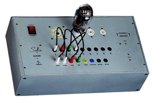 SOFIA TUBE TESTER BY AUDIOMATICA, ITALY This was the first commercially available PC aided tube tester, and it was and still is a very good machine. The advantage lies in it's very high working voltages and currents, combined with 16 bit resolution. There is no other tester that can do 700V at 250mA not even old analog tester, I do not know of one. The disadvantage is, there is no support of any kind. Only thing is, you can send it in for repair, and they can try to fix it as long as they have parts for it. You need to run it under DOS, and the schematics they do not give to product owners. This is accepted for running production, but for a discontinued product, I miss the point of this. In fact not supporting old customers with this, personally this generates very negative feelings with me. Of course this is only my personal view. So before I buy a new product from this company, I think also of the day where it will be discontinued, and I get stuck without schematics. This tester was made for DOS only. It will not work good under windows, since it needs real time access to the RS232 and LPT1 port, and not the manipulated ports as in Windows versions. A DOS emulator solution exist, but it works not fully reliable. What is it worth? Hard to say. Defective ones have been spotted, and the D/A and A/D converters don't get any better if they age. So the one you buy many be fine, or just as well not. Take care before you buy one. Repairing a Sofia will be not easy. What is good and bad about it: +++ Top class software. Curves are professional looking. Not those 'Microsoft' curves of the Amplitrex.