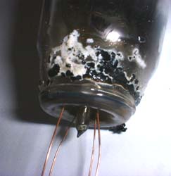 Everybody, working with older type tubes knows the problem, the sockets can get loose. Fixing this is not easy, because glass is hard to glue as you may know. The high glass temperate will either make that any regular glue will soon break off again, or some glue types will crack the tube glass when the tube cools down. The best way to attach the base, is original tube base glue. This is a mixture of pre-burned resin, grinded stone, and other ingredients. It must be solved in alcohol and then baked in an oven at 175 °C for 45 minutes. When done well, this will last a few decades, but after that get brittle and the socket gets loose. But... the disadvantage is, it cannot be used to repair historical tubes. The very old tubes may crack the glass when the tube is baked into an oven to cure the glue. The problem: how do we repair those old tubes? :( Two components glue. This will get loose soon, or worse it can cause a glass breakage after some months of storage. It causes a circular crack, and the whole glass bulb comes off. :( 10-seconds glue. I call it Ebay glue. For absoltely sure, it will come off again later. After enough w arming up cycles it will not stick to the glass anymore. Also any drips along the tube base can't be removed. So you may end up with a smeared tube base, and still the base is loose after some time. The Solution: Use our repair glue. First, here s is the composition of historical tube base glue: Stone powder, Orange Shellac particles, Resin, Aniline. Then, this powder is solved in Alcohol, and the glue compound must be used within 4 hours. This glue has a similar expansion coefficient as glass, which is very important, or you would get glass cracks. Glass is curious material. When there is mechanical tension on it, for months or years nothing will happen. Then, suddenly it will crack, usually at pre-exposed places. Like when the glass is bended, or where the glass touches the tube base. Also the surface right behind a getter in the tube base, was exposed to large heat during getter flashing. If there is mechanical pressure on the base, a crack may develop behind the getter. A general problem we all know, hot glass will crack when it touches a fluid like water or alcohol. This property, let's call it a problem too, will get very much worse, when glass gets older. Pre damage may remain unnoticed for years, and later crack. The original tube glue is applied as a wet compound. So during hardening in the oven, the alcohol will at first evaporate, and then the resin and shellac will burn, and form the final glue. During this process, the glue will boil, and in the beginning, the temperature of the glue cannot be higher as the boiling temperature of alcohol. Whereas oven temperature is higher. This temperature difference will pre-damage mainly OLD glass. Even new glass wants to be treated carefully, but old glass will damage for sure. Then after a few days, months or years, your repaired tube will crack. We had to learn it the hard way, this is definitely NOT working on older tubes. Something similar occurs when you repair older tubes with two components epoxy. This will put mechanical force on the glass, which force is temperature dependant, and after months or years, the glass may crack. Also this seemed NOT a good idea. So a repair glue must be applied cold, and have the same expansion coefficient as glass. We have developed a glue for this. It will repair the base permanently, without destroying the original glue compound inside the tube base. So the tube stays as original as can be, with no signs of the repair afterwards. There is no need to desolder the wiring. Though a re-solder afterwards is recommended, but only when you are sure you can nicely do this. If you need to learn this, practice it first on a tube that you want to dispose anyway. The used glue mixture is a result of many trials. The tube glue we have now, is based on three solvents that are mixed. The base compound makes the glue look milky and reasonably water solvable, which is convenient when you work with it. Also the glue contains some stone powder and shellac, which helps to fill small gaps. With this glue, you don't need to remove the socket. Any dirt between the base and the original old glue does not need to be removed. This glue will form a strong and flexible compound with any old residue. The Emission Labs ® repair glue contains a material, that soak inside the old glue compound and rejunivates it. Like this the old glue can stay in place, and the base does not have to be removed.
