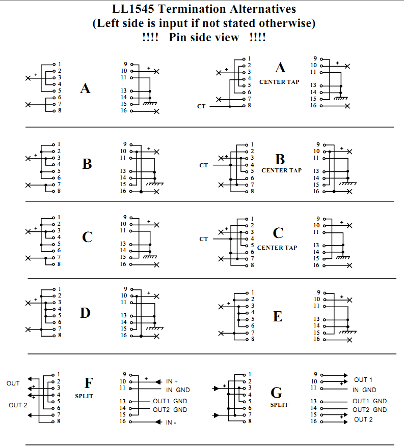 IMPORTANT: Lundahl uses two approaches, to use the LL1544A + LL1545A + LL1550. It comes down to the same, but there are two ways to achieve it. Some data sheets describe the complete configuration, with Input and Output in one drawing ("ALT" System). Some other data sheets give separate input and output circuits, and you can make your own combinations.