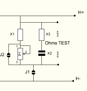 This 2k4 comes now at the position of X1, and with the potentiometer of 150k, we get now a load between 2k4 and 152k. (Leave J2 open). Verify this at the test points, with an Ohms meter. If ok, close Link J1, and now the network is connected in parallel to the secondary side. (H+ and H-).