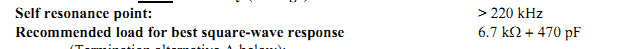 For tone transformers, the situation is another. We do not want to damp the signal over the whole frequency range. Instead of that we no frequency roll off at the high or low end of the audible range, no phase error introduced by the transformer, and no distortion. All tone transformers however have something called self resonance. This means at high enough frequency, the output signal increases by itself. When this happens, distortion and phase will occur as well. It is relatively easy to do something against this. All we need is an extra resistive load, which comes in at the self resonance frequency. This resistor is coupled via a small capacitor, so it will become only effective at the resonance frequency. This works simple and good. When this resonance is damped, it will be gone. So the result is an RC network in parallel with the output. We can change the resistor, to make the network become effective at the desired frequency.
