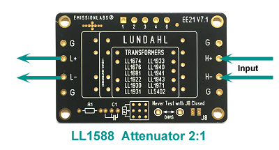 Brother of LL1684, but LL1588 may have a small DC component, for instance with a DAC. Board may also be used reversed, to get attenuation. |