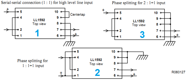 LL1592 | 2x | Unbalanced Amplifier input with 2x Gain Connect to Ground: L-, H-, G. |