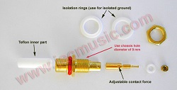 I recommend this as a standard for tube amplifiers, using the RCA (Cinch) input for this. Like this it becomes compatible with all existing equipment. Yet, it gives the advantage of a hum-free, balanced input. More information about this. For this however, an isolated ground type RCA (Cinch) connector has to be used, such as the Yamamoto.