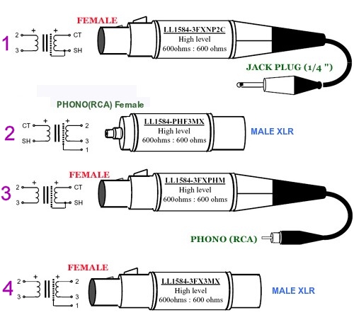 PART2: 600 Ohms - Lowimpedance Series. LL1584-xxxx Family Can used in both directions. Application: From low impedance source, to high or low impedance input. Such as from low impedance ( 600 Ohms or lower) pre-amp, to input of Power amplifier, etc. If source is above 600 Ohms, this LL1584 family cannot be used, but use LL156X family instead. LL1584 is available in four versions: