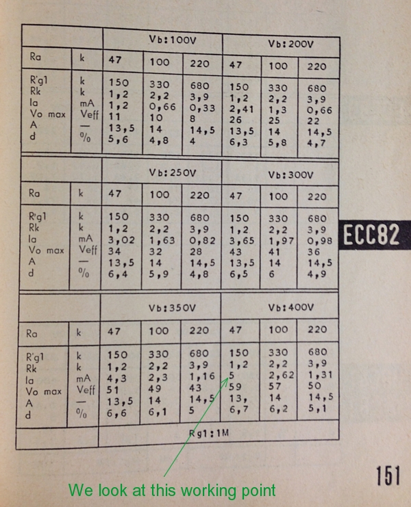 This is the marked operating point of the data table above here. This requires a Vb of 400Volt, but at least we can get 59V RMS that way. The construction is done only quickly by hand, so for precise data, read it from the data table. The intention is only to display it graphically.