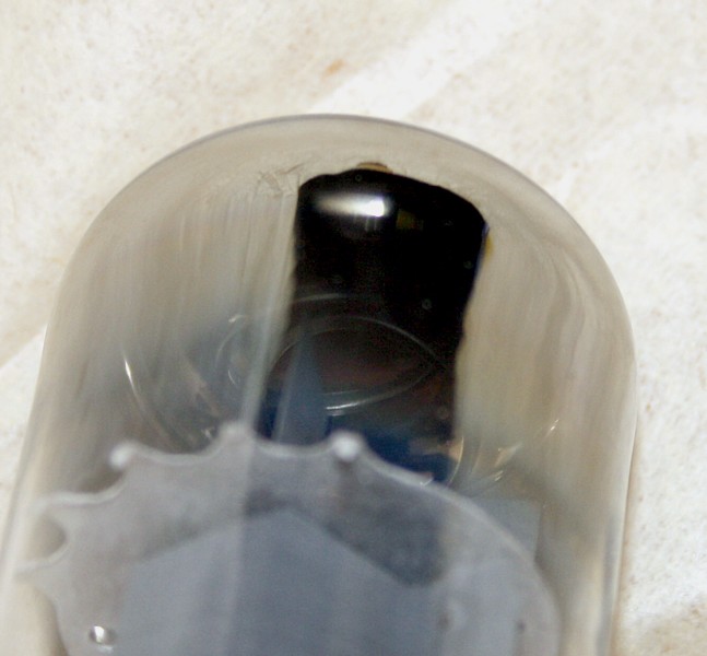 The bulb is hard glass. It has Four (!) getters, and inside made from hard metal. You can hammer a nail in the wall with this tube. Much different from the fragile KT88. The metal piece can be removed from the top, using a hot air gun, like you use for hair drying. Bake the top, and the glue will get soft then, and brittle away. The bakelit tops you can srew off, and are even nice feet for a small amplifier, no joke, these are lovely made.
