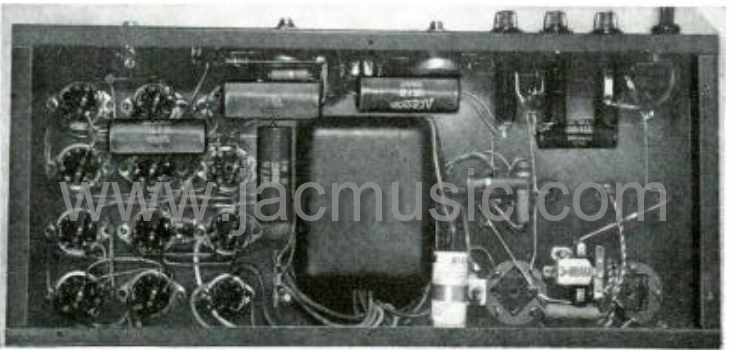Several products . The pictured amplifier works with 8x 12B4, a VERTICAL deflection tube for TV picture tubes. At the chassis side, it was quite empty. Most of it was wiring and a few coupling capacitors. Look at this fantastic data: Power Output: 10 Watt into 16 Ohms, @ 0.1% distortion. High frequency response: 20kHz at 1dB at full power. 250kHz at 3dB