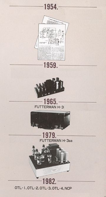 Test of Futterman H-3aa in 'The Audio Critic' 1979Please first read this interesting test above, in 'The Audio Critic'. The writer has a comment about the feedback method in this amplifier, and also about future unavailability of the 6LF6 tubes. Then read the comment on that, by Julius Futterman. 1979 Letter by Julius Futterman,to the Editor.'I am pleased with your evaluation of the sonic virtues of the H-3aa power amplifier but do take exception to two of your assertions : 1. The power tubes I use (6LF6) are being manufactured in the USA by GE and Sylvania. They are also being made in Japan and Yugoslavia. I have been informed that they will be around for many years. In your Vol. 1, No. 3 issue, page 4, you wrote that the Berning hybrid tube amplifier using 6LF6 tubes will be manufactured by Audionics. Also please note: The Acoustat X ($2.200) uses 6HB5 tubes, which is also a TV tube. This tube was used in my H-3 stereo amplifier in the 1960's. The Beveridge 2SW-1 ($7.000) uses 40KD6 tubes, also a TV tube. My point is at these two types are of even older vintage than the 6LF6 tube, yet you did not caution a buyer of the Beveridge system about their not being able to obtain them in a few years. I am sure if tubes do a better job in an amp or pre amp they will always be available from one source or another. 2. Before taking up the second subject that makes me unhappy I would like to digress for a minute, if I may. Before transistor amplifiers the rated impedance of most high fidelity speakers was 16 ohms. In Britain practically all speakers were 15 ohms. There were sound reasons for this as, all other things being equal, a higher impedance speaker is more efficient and the crossover design is not as complex. We are referring, of course, to moving-coil speakers. 3. The reason for the lower impedance of speakers today is, of course, the fact that transistor amplifiers, being voltage limited, provide more power for such speakers. As an interesting aside you implied in your review of the Tangent RS2 (Vol. 1, No. 5, page 25) that it was an inefficient speaker as you were able to make the Levinson ML-2 clip on it with a master tape of piano music. On the other hand, I can make the Tangent RS2 play very loud with the H-3aa. The reason for this is simple : The impedance of the RS2 at 70 Hz, for example, is 11.5 ohms; at 500 to 2000 Hz it is 9 ohms, and it rises steadily to over 20 ohms at 6 kHz, which is well above the fundamental tones of the piano. With the ML-2's 14 volt maximum voltage rating you can see that there is very little power to drive the Tangent. End of digression. 4. Electrostatic speakers are inherently of high impedance and this is lowered by means of a transformer. The Acoustat and Beveridge speakers use a different approach. They do not use a transformer; instead they employ very high voltage amplifiers to drive the speakers directly. The KLH-9, Quad, and Koss are examples of speakers using transformers. In general, the lower the turns ratio of the transformer the better the speaker because of tighter coupling and other factors that 1 will not go into here. The KLH-9 impedance is 16 ohms, the Quad 15 ohms and the Koss 4 ohms The KLH 9 and Quad were designed for tube amplifiers, the Koss for solid state. Thank you for allowing me to comment. Sincerely yours, Editorial Reply to Julius Futterman's LetterIt was unquestionably a miscarriage of justice that your amplifier was singled out for our general caveat about the future of vacuum-tube audio equipment. What's true of one particular design is true of them all: their longevity depends on the TV replacement market, the Russian aerospace industry and other factors outside the world of audio. We seriously doubt whether audio manufacturers by themselves could keep even a single vacuum tube factory in business through the 1980's. On the other hand, you may be quite right insofar as these other demands may preserve vacuum tubes from extinction for decades to come. Your guess is as good as ours or anyone else's. The rest of your comments all point to an implicit conclusion we have shared for quite some time, namely that the power amplifier and the loudspeaker should be conceived and designed as a single system, the "back end" of the audio chain, not as two separate all purpose modules that never quite mate optimally. The trouble is that very few audio designers have an equal mastery of both disciplines. For example, neither the Acoustat nor the Beveridge amplifier is as highly refined as yours, although their philosophy of integrated design is certainly valid. -Ed. The Audio Critic , 1979 Note by Jac about the use of 6LF6: Audio Critic makes a guess in 1979, about why TV tubes used by Futterman will soon become unavailable, and they write audio manufacturers cannot keep one single tube factory alive. Well, there is really a fundamental mistake in the reasoning of Audio Critic, and that is not because they could not know about tube HiFi being so popular now. It is rather not doing the math right. Tubes like 6FL6 were not used anymore for new design TVs somewhere around 1975 or so. But indeed, the TV replacement market was huge. A color TV used three of them. So the replacement market was accordingly large. One way or another, millions of 6FL6 are stored on boxes, barns, garages and other places. From this, some small supply of 6FL6 will always pop up. Probably small quantities, but it will occur very often. Just because they were made in such massive quantity. The situation would be totally another if we would be talking about a tube of which few were made ever since, and now everybody wants it. Like Telefunken ECC803S. That is very difficult of course, but with 6FL6 it is really the opposite. In addition, there is also the possibility some industry stock pops up, and then for a while there will be many for sale. About EL509:Theoretically it could replace 6LF6, but he EL509 market consists mainly of junk and fakes. The Russian ones can 