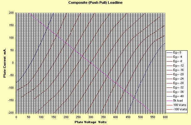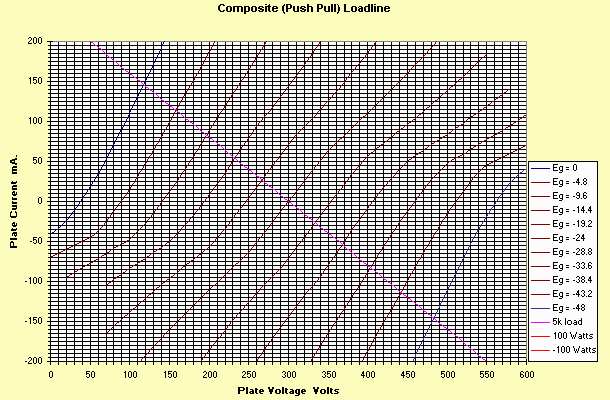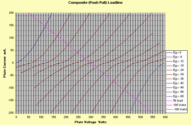Part 4: The Effect of Bias Change on Composite Loadlines - from Class A through Class AB to Class B There has been some speculation whether there is a large or small difference in the sound quality of a Class A or a Class AB amplifier. This rather short part of our series shows the effects of altering the amplifier bias. For consistency, the same "invented" tube is used. This first curve is pure Class A, with both tubes drawing current during the entire cycle. Notice the very constant plate resistance, and very smooth composite set. Very little distortion will be heard, whether the load is resistive (as shown), or very highly reactive (the load line looks like an ellipse instead of a straight line).