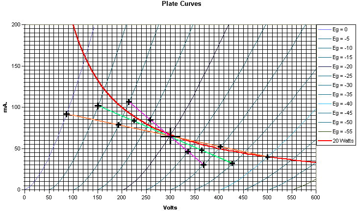 There is another, in some sense, worse effect. Let's further "modify" our hypothetical source by placing a smaller, high frequency sine wave component on top of the square wave. I'll stipulate that this signal's frequency happens to be at a relatively low speaker impedance point. Now what happens. The portion of the sine wave riding on the high current part (lower impedance) will have higher "gain" than that portion riding on the lower current part of the loadline. This is an insidious form of intermodulation distortion that is usually not very musically pleasing. You can somewhat minimize this effect during the establishment of your load line. If you followed the procedure I outlined in part one, go back and re-plot the loadline using HALF the resistance, then TWICE the resistance. Don't be particularly concerned about whether the newly plotted loadlines remain inside the power dissipation characteristics. (Why THAT is, is outside the scope of this particular article). Now calculate the distortion FOR APPROXIMATELY THE SAME power output on these 3 loadlines. Continuing with our example, this is shown below. The original loadline (4k) is green, the 8k loadline is orange, and the 2k loadline is magenta. I've shown the current and voltage points needed by black crosses on the curve.