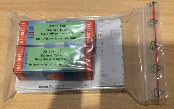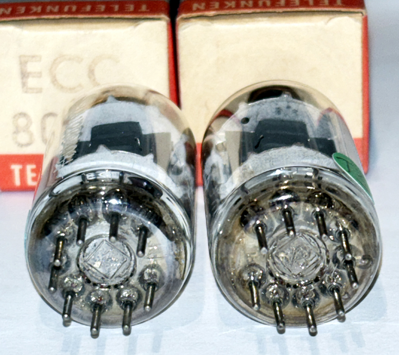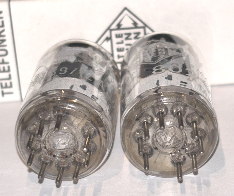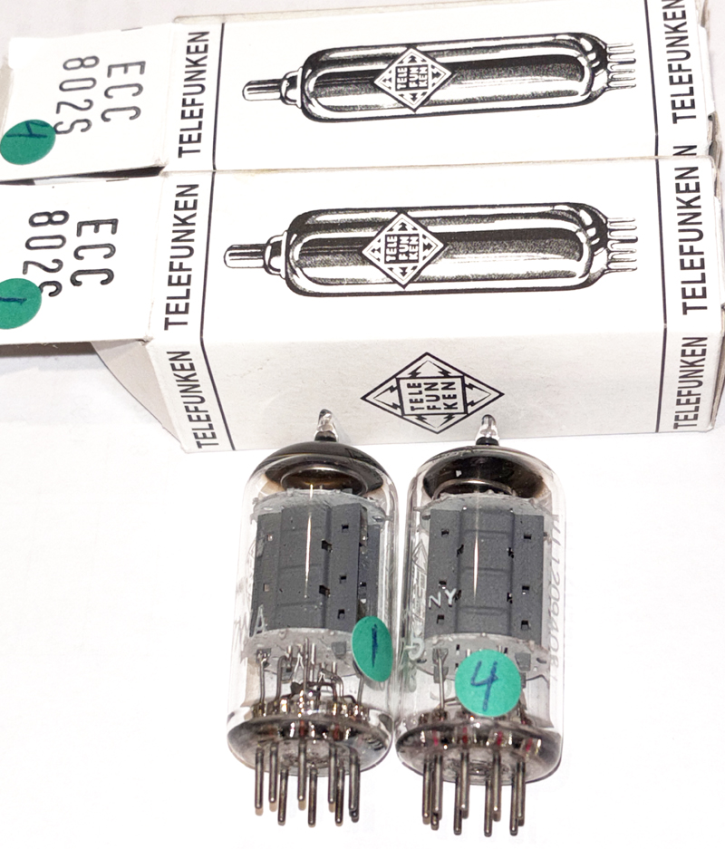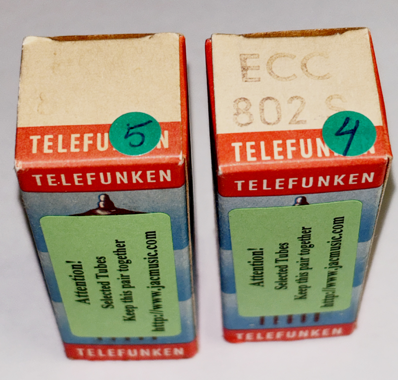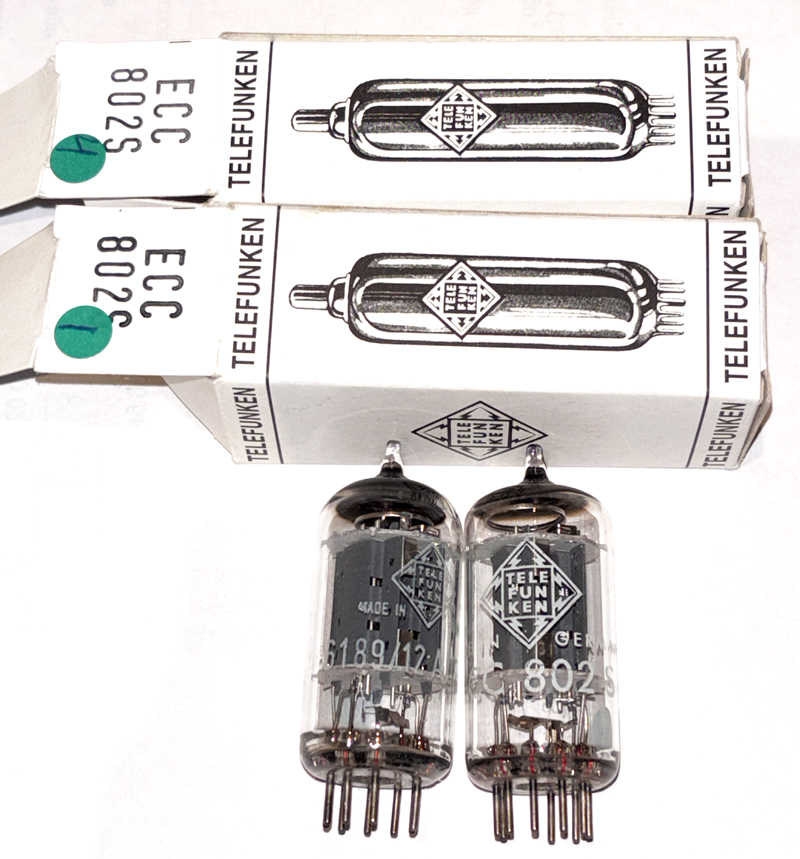Telefunken <> ECC802S NOS. West GermanyThese tubes come with an Amplitrex computer test report. Beautiful optical and electrical condition. One tube is marked 6189/12AU7WA, which is the designation for ECC802S. The tube is made in Germany, with <> bottem and genuine ECC802S. The other tube is marked ECC802S. Picture1 - Picture2 - Picture3 - Picture4