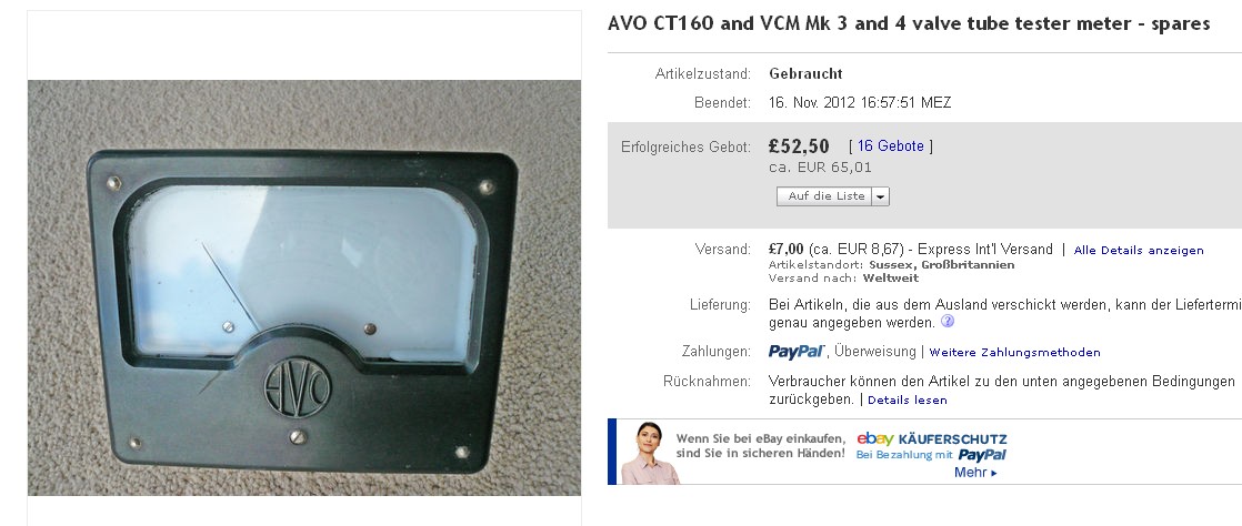 Meter availabilityOriginal replacement meters are impossible to get. What you see on Ebay reflects that a tester without meter is worth very little. You can't buy the meters, and who knows what's wrong with a tester that someone removed the meter from. I have only once seen once an NOS meter on Ebay, ever since 20 years, and it went for appr 700 Euro. So chances you find a new meter of Ebay, is virtually zero. Yet the price of 700 Euro was justified if somebody puts it in his tester, and sold the bad meter on Ebay. There is always somebody thinks he can repair it. Picture1 - Picture2 - Picture3 - Picture4 |