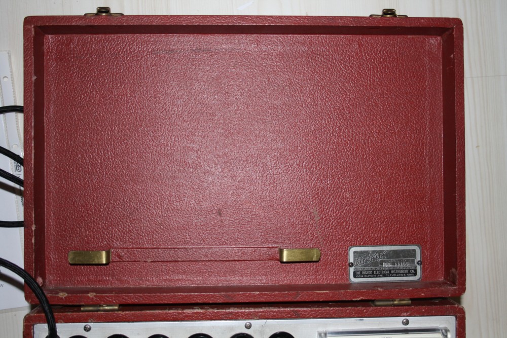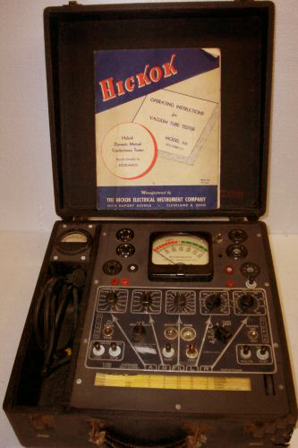 Micromho (=ma/V) readings, by means of a patented Hickok two-tube circuit which you will find in all testers with some variations. Some of the later solid state testers had the same circuit. Because of this 'standard' circuit, each tester is a good one. Future Tube life indication. The 'English' reading with most of the testers. Some Laboratory models have additional tests. Case is rugged and large, leaving us today plenty of room for upgrades Wooden case is extremely rugged. Deck plate is nicely engraved and solid. Gas Test. This is done with a standard test circuit, by putting a very high series resistor in the grid. The idea is, that tube gas gives grid current, and this will generate a small voltage over this resistor. The small voltage will add to the DC bias voltage, and change the bias of the tube. This change has always it's limits no matter what causes it. So regardless if it is gas if leakage, we always call it 'gas' when you have a Hickok. Noise test. This seem a nice method, though I must admit never tried it. You have to connect am AM radio receiver antenna to the noise test output, and if there is any noise, this will give loud crack sounds on the radio.