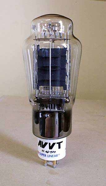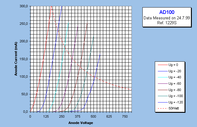 Note4) Driver tubes. It pays off to drive the AD100 with a tube like AD1, or AV8, because these tubes have the same harmonic distortion spectrum. When the driver tube is operated in the same way as the AD100, the 2nd harmonics will be partially cancelled between the two tubes. You will find more about this in circuit design books. (for instance: R. zur Linde: "Verstaerker in Röhrentechnik". ISBN Nr: 3-928051-02-4)