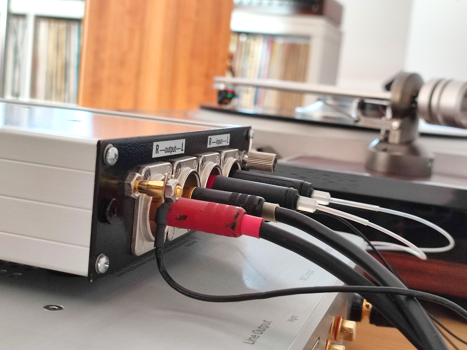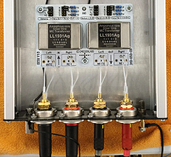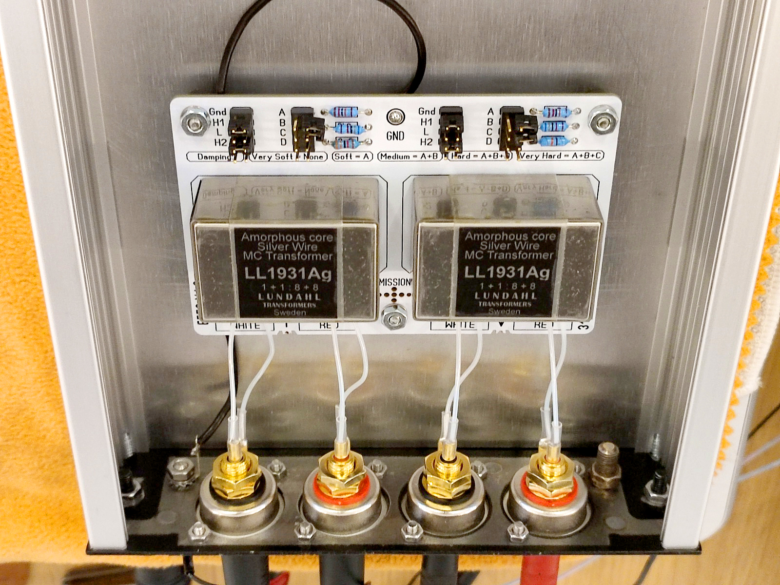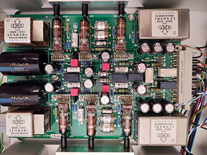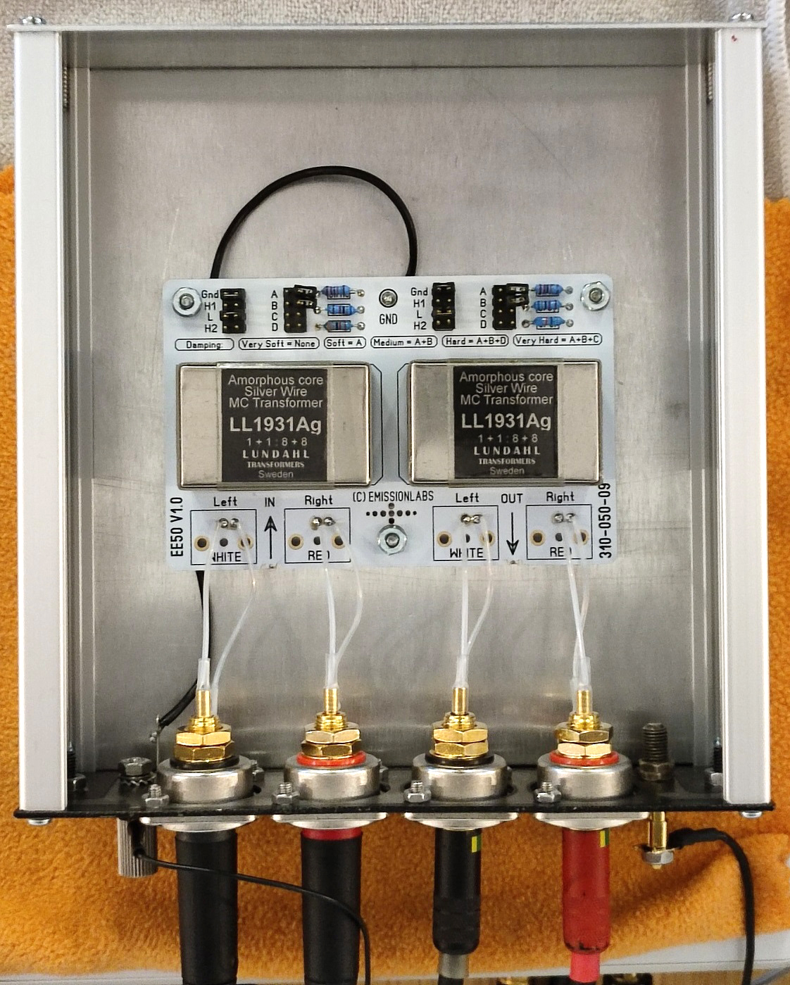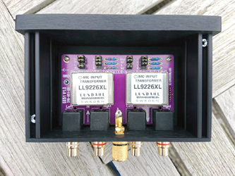 This litte box contains treasure transformers, the pure silver wound transformers LL1931Ag, with amorphous cobalt core. The large box is the EMT128 pre amplifier (Pictured from the inside), using also Lundahl transformers.