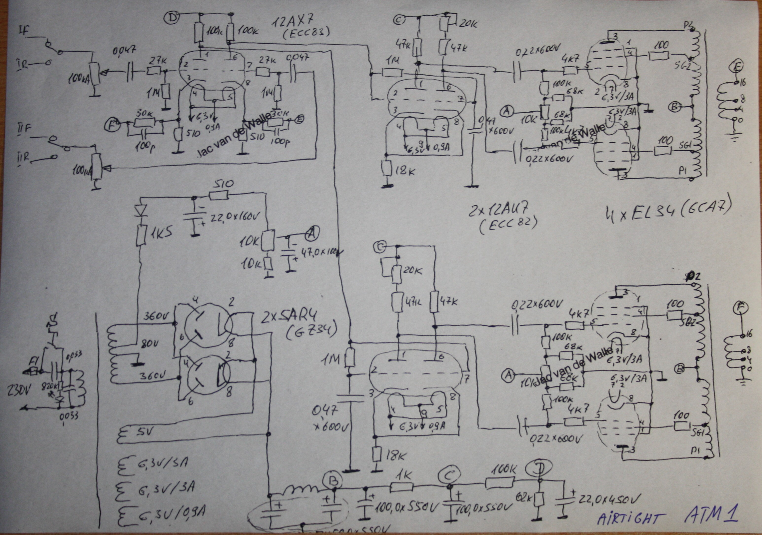 It should be well known, but I just mention it here anyway, you can not connect 220V amplifiers to 230V or even 240V without a mains adapting transformer, unless the amplifier is specified to do so. So basically all vintage products. Heater voltage tolerance of tubes is maximum 5%, but taking 5% as a default is a very bad idea also. Plug a 220V amplifier in 240V, means 10%. This will definitely damage the tube heaters, but also DC voltages and currents inside become wrong, and the mains transformer may produce mechanical hum. From this schematic it gets clearer what you need to look at. There is a phase reversal stage in here, with two ECC82, and it has an adjustment potentiometer. Adjusting this stage is 'overall' so it also affects the EL34 stage, which is drives. I would say, the best way is adjust this with an oscilloscope, so the El34 output stage is driven nicely symmetrical at full power. You need to do so, after bias adjustment. Now comes, what I think is important to know. These ECC82 tubes are Electro Harmonics tubes with the Air Tight logo stamped on it as well. Generally speaking, Electro Harmonics I have found to have a much larger parameter variation than NOS tubes, and the EHX ECC82 seems to draw less current than an average ECC82. So I would say, EHX is not an ideal tube for this, but it can be used. However, it was chosen, and since the amplifier is adjustable it doesn't matter anymore. Since the adjustment of the amplifier is an adjustment for the individual set of tubes, the best way is to have the amplifier re-adjusted by a real specialist after a tube change. Furthermore, since two random ECC82 can be quite different, you should never exchange those amongst each other by mistake. Needless to say, this can happen quickly! So the recommendation is, when you have those ECC82 replaced, you should always take what is called a balanced, matched pair. Something similar applies for the EL34. Each channel (Left and Right) has it's own balancing potentiometer, so in the end you'll end up with different settings for those two potentiometers. Once that is the case, you cannot exchange the EL34 amongst each other. So the moment you pull them all out, you should mark them carefully 1....4. This said, it is obvious, you cannot just replace the ECC82 and EL34 by 'some' tubes. The EL34 (Left and Right Channel, are controlled by the SAME bias voltage, so for that reason you can only put a matched QUAD in this amplifiers, and not two pairs. Overall this is a really very good schematic, and once adjusted correctly, the EL34 stages should work very good. Apart from what others say or do, my opinion is, best results will only come from a proper adjustment by using an oscilloscope. Disclaimer: This schematic was hand drawn from an ATM-1 and it may have mistakes in it. |
