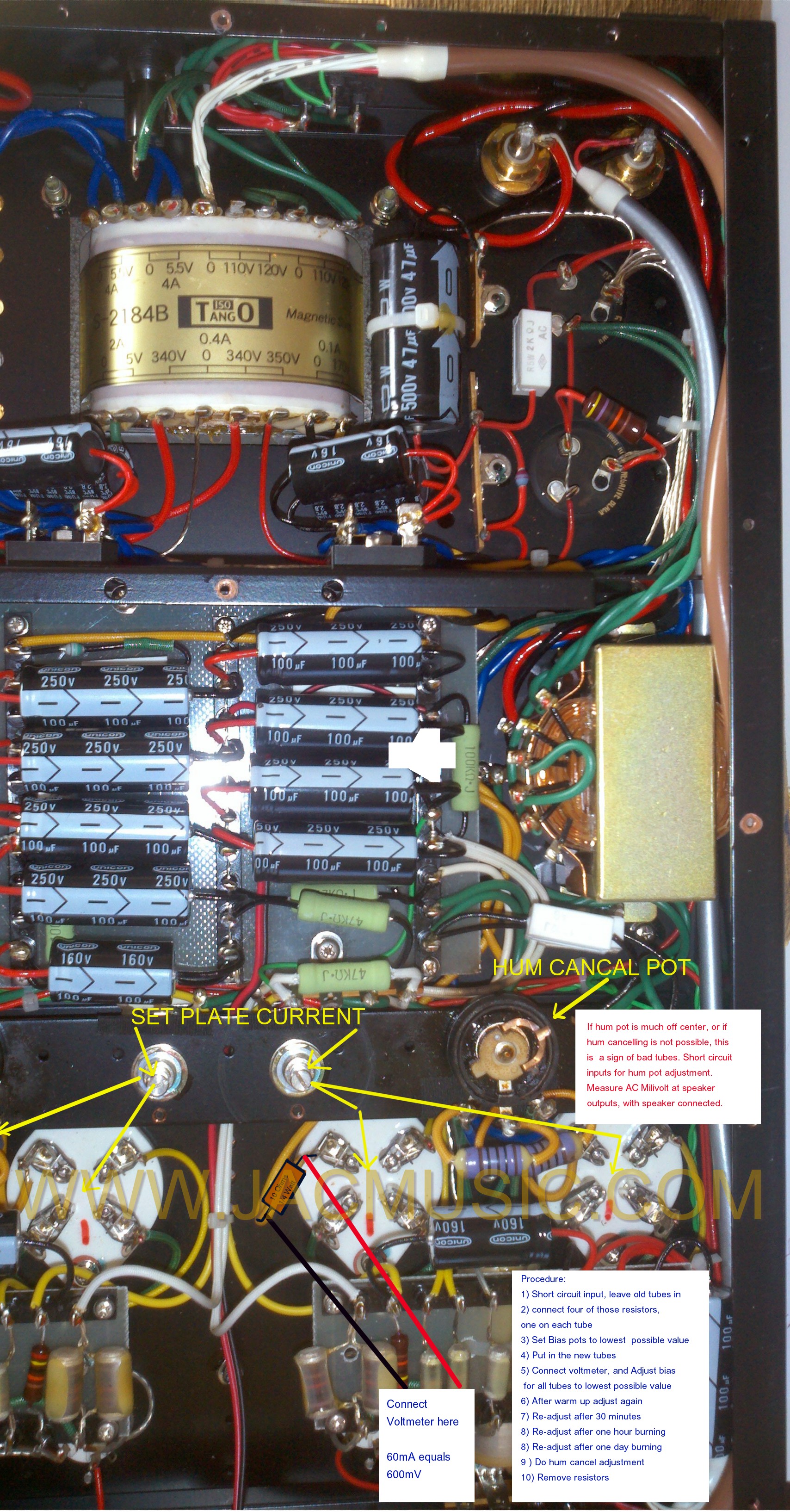 VTL. Model: ST 150Adjustment range is not very high, and (good) new 6550 tubes may draw not enough current. When ordering Tung-Sol 6550, it appears you need tubes that are tested above 60mA, by the factory methods. The same values apply for EHX 6550. |