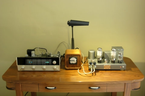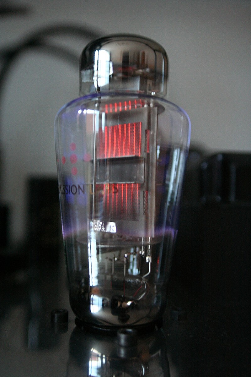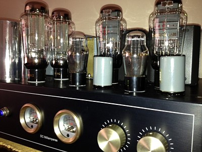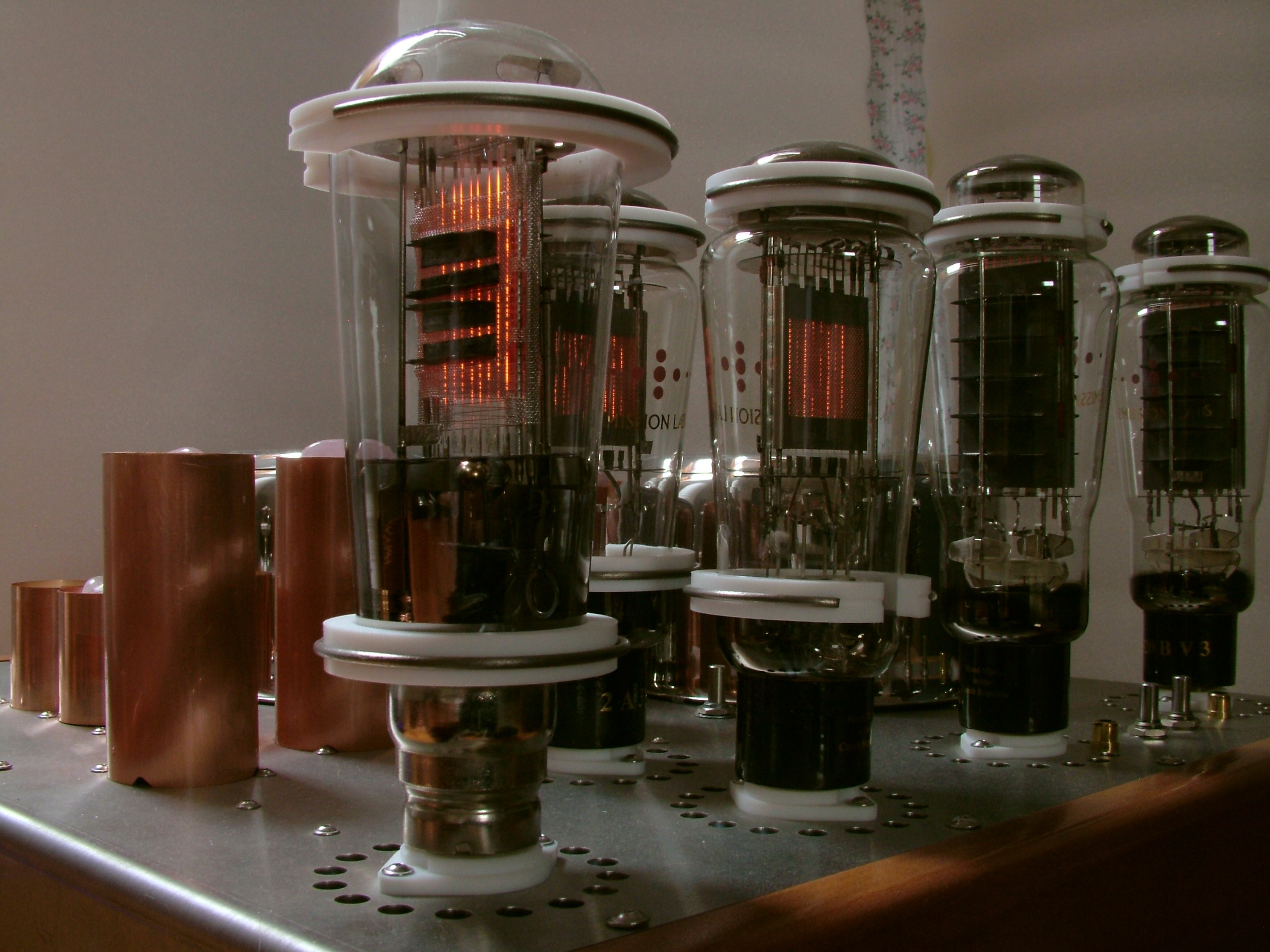Na het invullen van een stukje op de recensie website leek het me wel aardig te laten zien op wat voor versterker de buizen gebruikt worden. Op de eerste foto zijn de nieuwe buizen in bedrijf te zien, op de tweede foto de oude buizen.
