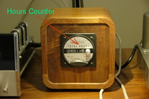 Here are a few pictures of the 45 amp and the elapsed time meter. The elapsed time meter was zeroed 22 months ago; I was originally planning to zero it every year but forgot June of 2013. It averages between 3400 and 3500 hours per year and the variance is due only to the number of days I am away from the house. This amp it turned on every day with a time clock switch so it wakes me up every morning and it is on for approximately 9.6 hours every day that I am here (almost always). I received the amp back in March of 2008 to the best of my memory and it has played every day since except for the rare holiday I take away from the house/ laboratory. I had difficulty with light so I had to move the amp to where I could get some pictures. I am going to leave the WE 717a tubes in because I prefer them to the original red 5693's. Both the 5693's and the EML 45 solid plates were in the amp since new. I tested both the EML 45's and the 5693's this week with my tester. I use a Hickok model RD Instruments 1575 for Research and Development - it appears identical to the Hickok Western Electric version KS-15750-L2 and uses the same roll chart to test all the Western Electric tubes.
