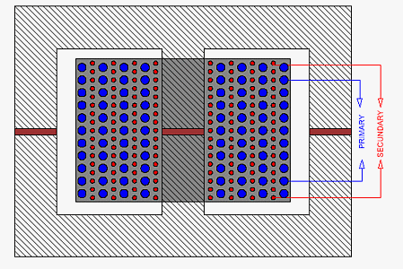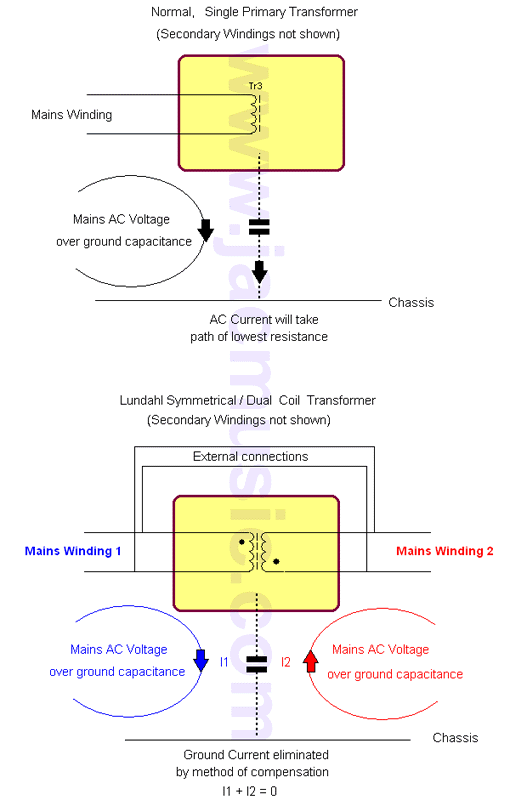 With classical transformers (Not Lundahl) you have a primary winding package, and a secondary winding package. Lundahl has a brilliant way to make their mains transformers. This results in a fully symmetrical construction. They use no separated primary winding and a separated secondary winding. On the LUNDAHL mains transformers, the whole configuration is present two times. So on a 250 Watt core, are actually wound TWO identical transformers of 125 Watt. Each copper package has it's own primary. The windings of those are serialized or paralleled in order to get the required voltages, and by this it is possible to eliminate most of the parasitic current, flowing through the ground capacitance. So ground capacitance cannot be avoided, but the current trough it can be greatly reduced. This is a mains transformer to be proud of.