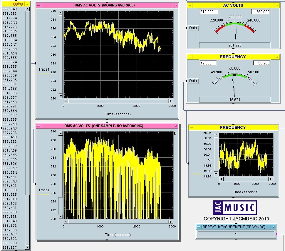 RMS AC VOLTAGE. MOVING AVERAGE. Here, the meter's internal averaging. method is used. So when the voltage is instable, like 228,232,228,232, the result would be 230. Same as when looking at the front of the meter, set it for RMS, and read the display. The average value (like a normal meter shows on the display) is much cleaner. When you connect any normal voltmeter to the mains, you will see a steady voltage since it averages out the values. However, I have displayed both plots here, to see. It is very hard to give good interpretation to this, and what it can do to your equipment or not. However, I can only make the conclusion a mains transformer nowadays has to deal with larger problems than 25 years ago, when the world was analog. People were yet not loading the mains aggressively with phase cutting electronics, AND not pumping back in energy from solar panels, which uses phase cutting electronics as well.