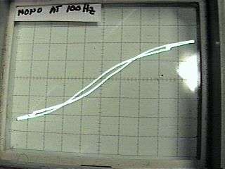 I reported two types of ceramic capacitors, one a 100 volt Z5U part, one a 1000V Z5U. To this I will add one additional part: the ubiquitous monolythic "digital logic" bypass capacitor. Here's the results: Notice that in the last picture, in addition to the non-linearities at the ends, theres another "kink" around the zero crossing point, adding yet another delightful characteristic to the sound! In fact, there's yet a worse characteristic to these type of capacitors: their characteristics change considerably with frequency. Here's the data at 600 Hz and at 100 Hz: Notice that there's hysteresis, "saturation" and odd kinks present in the curve. Just to prove there is no systemic setup problem, here's the characteristic of the mono at 100 Hz, and an oil-paper also at 100 volts: Nope: it's the ceramic doing that!